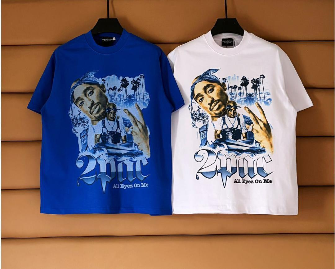 Iconic hip-hop energy in these ? 2Pac graphic tees! Oversized black or blue cotton with large "All Eyez On Me" portrait print, palm trees, and metallic distressed lettering – ultimate tribute piece for Lagos street flex.
