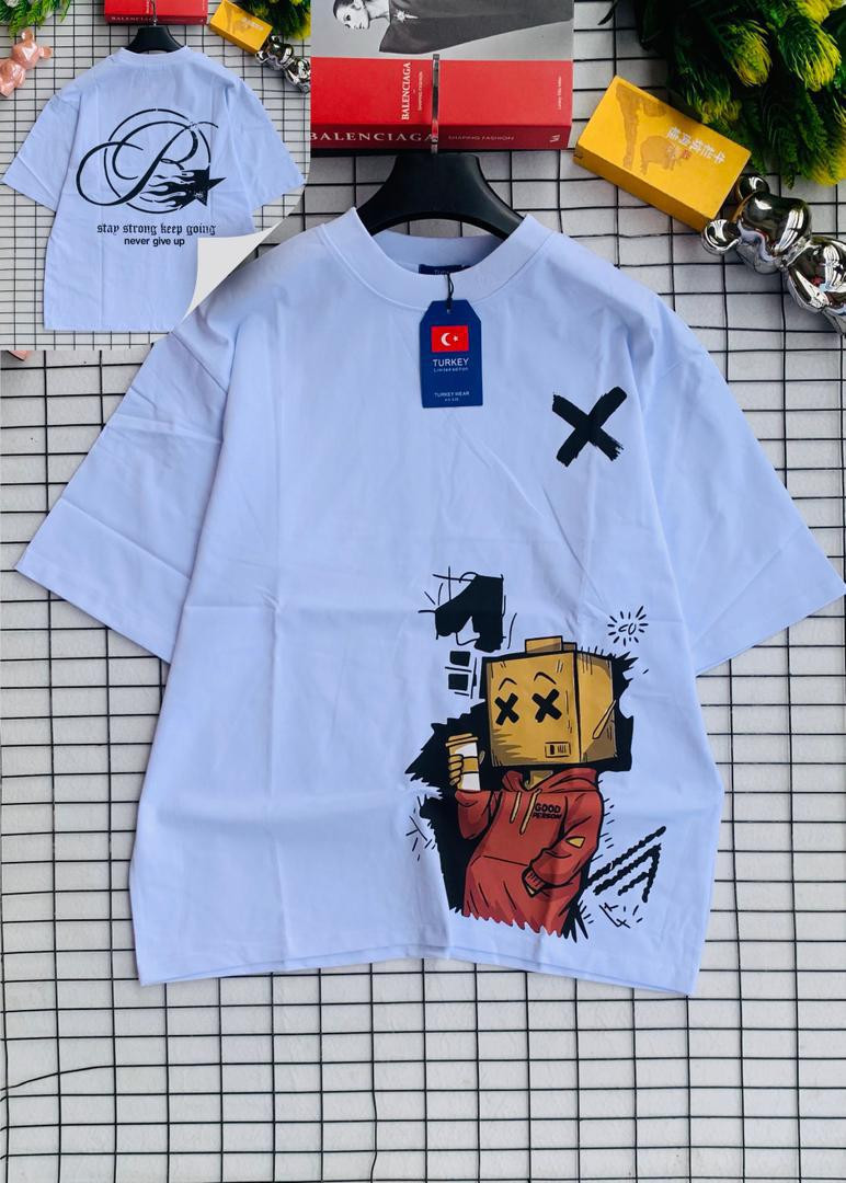 Front cartoon character + "GOOD PERSON" + back "STAY STRONG KEEP GOING NEVER GIVE UP" – uplifting statement design