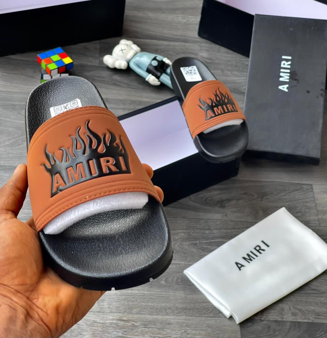 Turn up the heat with these black and orange Amiri-inspired slide sandals – fiery flame logo slides that scream bold streetwear luxury! The matte black EVA/rubber sole offers excellent grip and lightweight durability, while the contoured white foam footbed provides plush cushioning and arch support. The wide strap combines a black base with a striking orange overlay, boldly embossed with 'AMIRI' text wrapped in dynamic black flame graphics for that signature high-energy flex—perfect for Plumstead lounging, post-gym recovery, poolside, beach days, or effortless summer style.