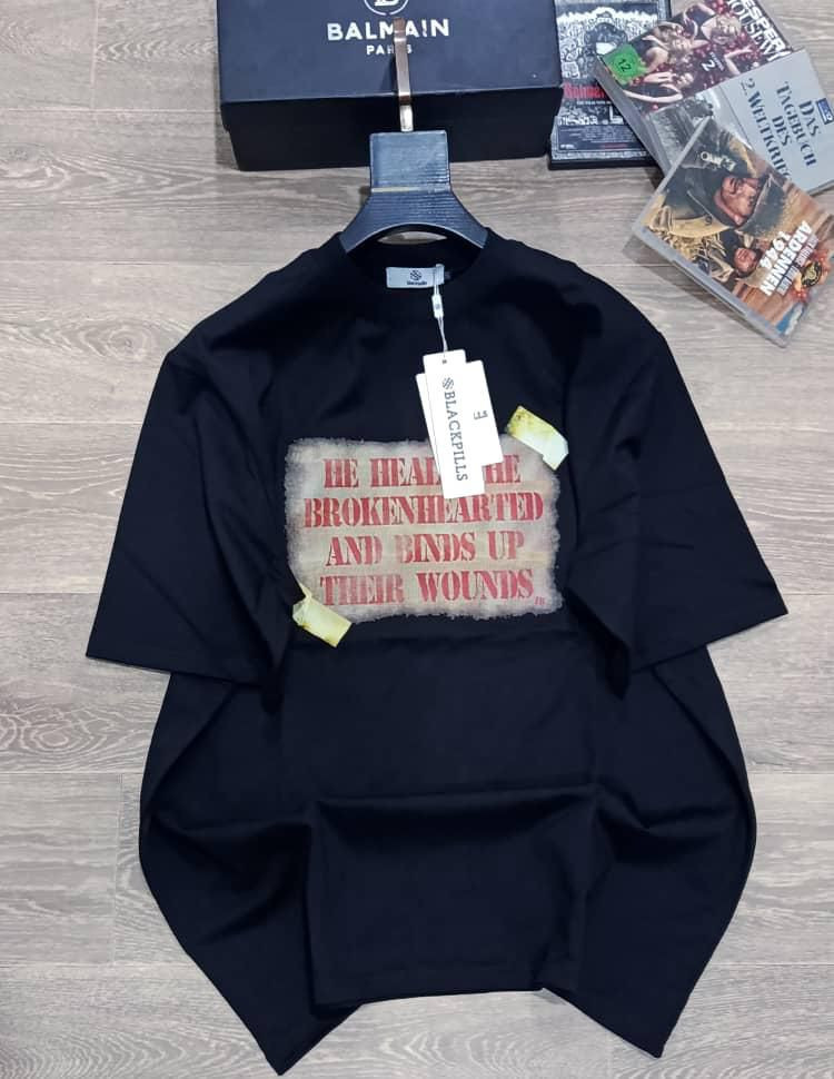 Wear inspiration with this ? black oversized motivational tee! Soft black cotton with large distressed red print: "HE HEALS THE BROKENHEARTED AND BINDS UP THEIR WOUNDS" on vintage parchment effect – powerful faith streetwear for Lagos vibes.