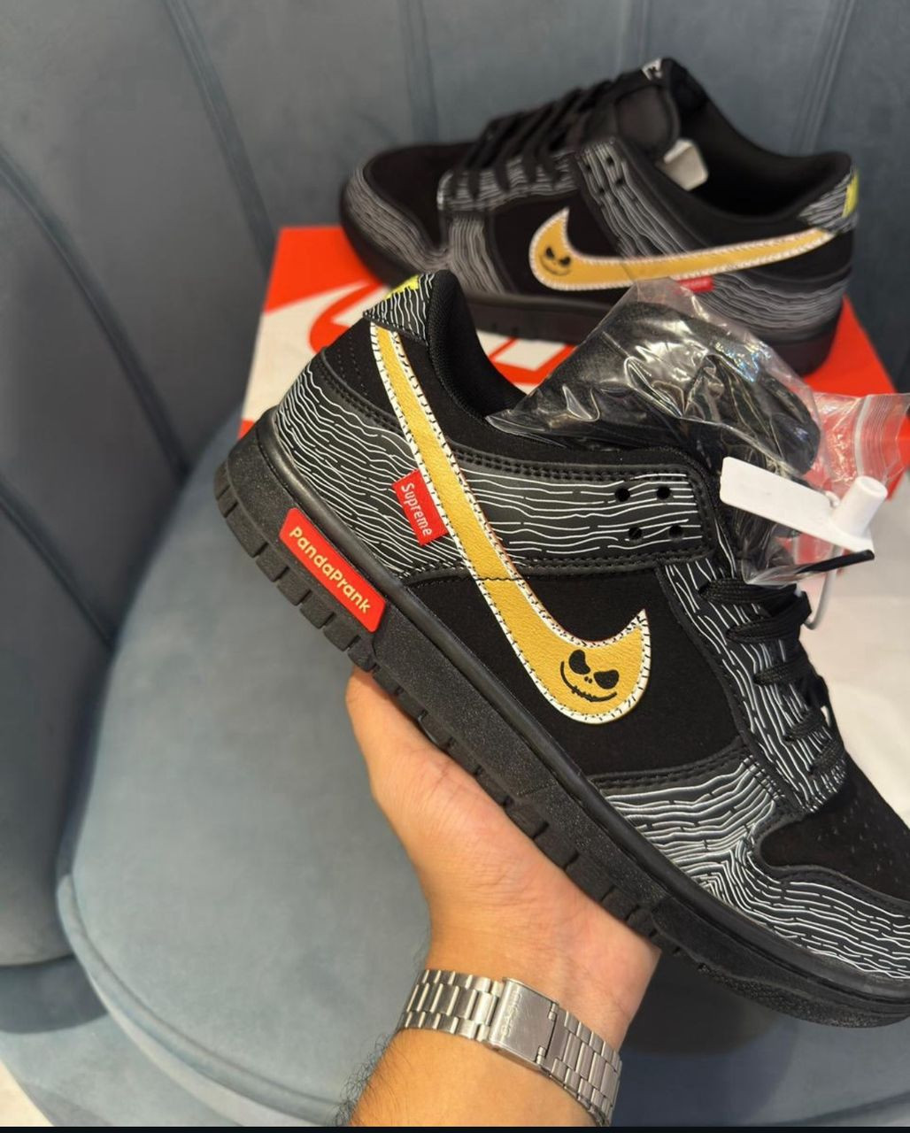Dunks! Black wavy/grainy upper with bold yellow stitched smiley face patch, red Supreme accents, and chunky sole – ultimate street flex for Lagos outfits.