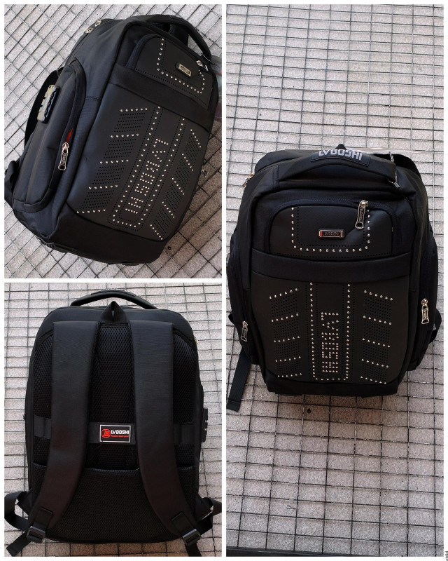 Sleek black studded tactical backpack – hard-shell design with perforated dot pattern and rivet accents, ideal for Lagos street style, daily carry, school, or urban edge!