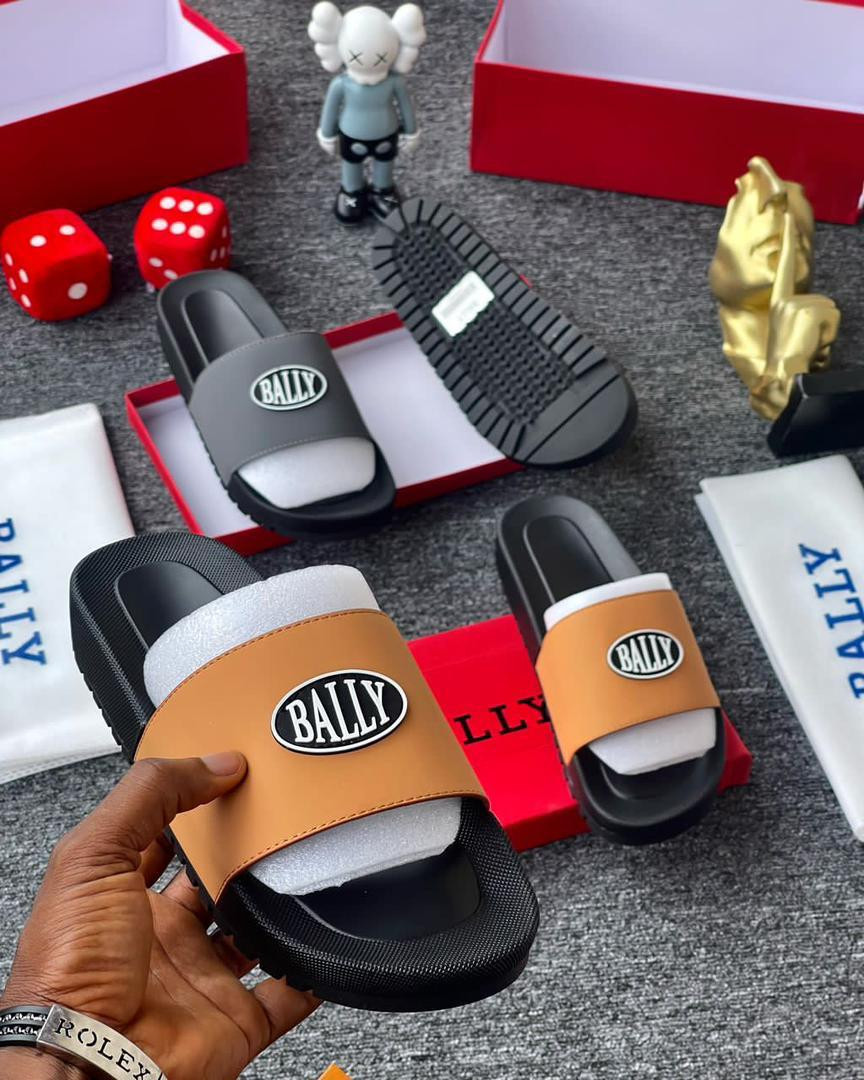 Flex timeless luxury vibes with these black Bally-inspired platform slides – thick soles meet clean logo print for effortless street status! The matte black rubber footbed and thick platform sole (deep textured tread, 3–4 cm lift) deliver grip and modern height, while the wide upper strap in black or tan/beige mesh/canvas-like fabric showcases the bold white "BALLY" oval logo print for that signature high-end flex. Cushioned insole, open-toe slip-on design, and durable EVA/rubber construction keep them lightweight, breathable, and water-friendly—perfect for Plumstead pairing with shorts/joggers/jeans/hoodies barefoot or with socks for streetwear, poolside, beach, gym-to-street, or everyday casual in mild February-to-summer weather.