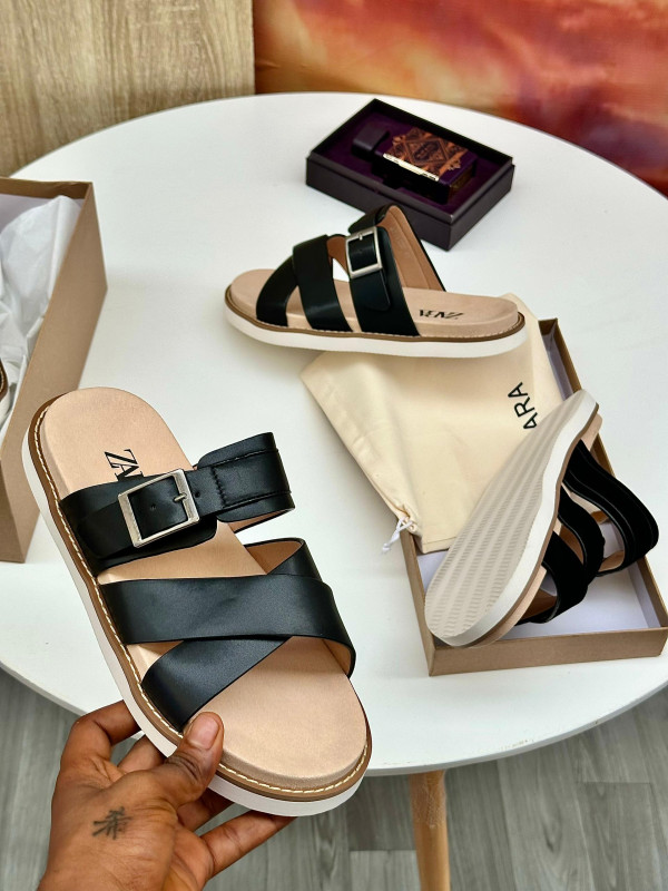 Elevate everyday looks with these ? black velvet cross-strap sandals! Plush black velvet upper with criss-cross straps, statement gold buckle, and low platform sole – Zara-inspired chic for Lagos summer vibes.