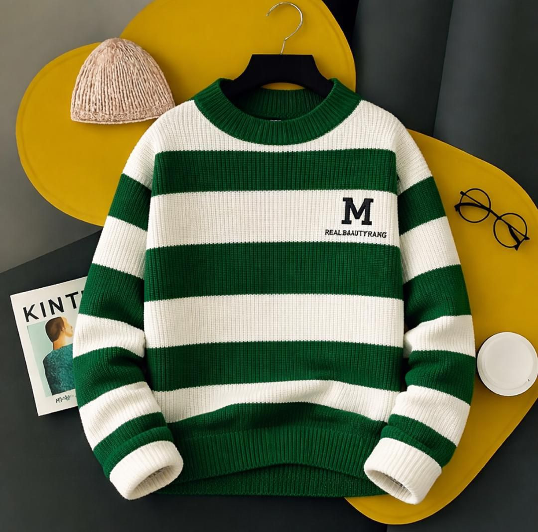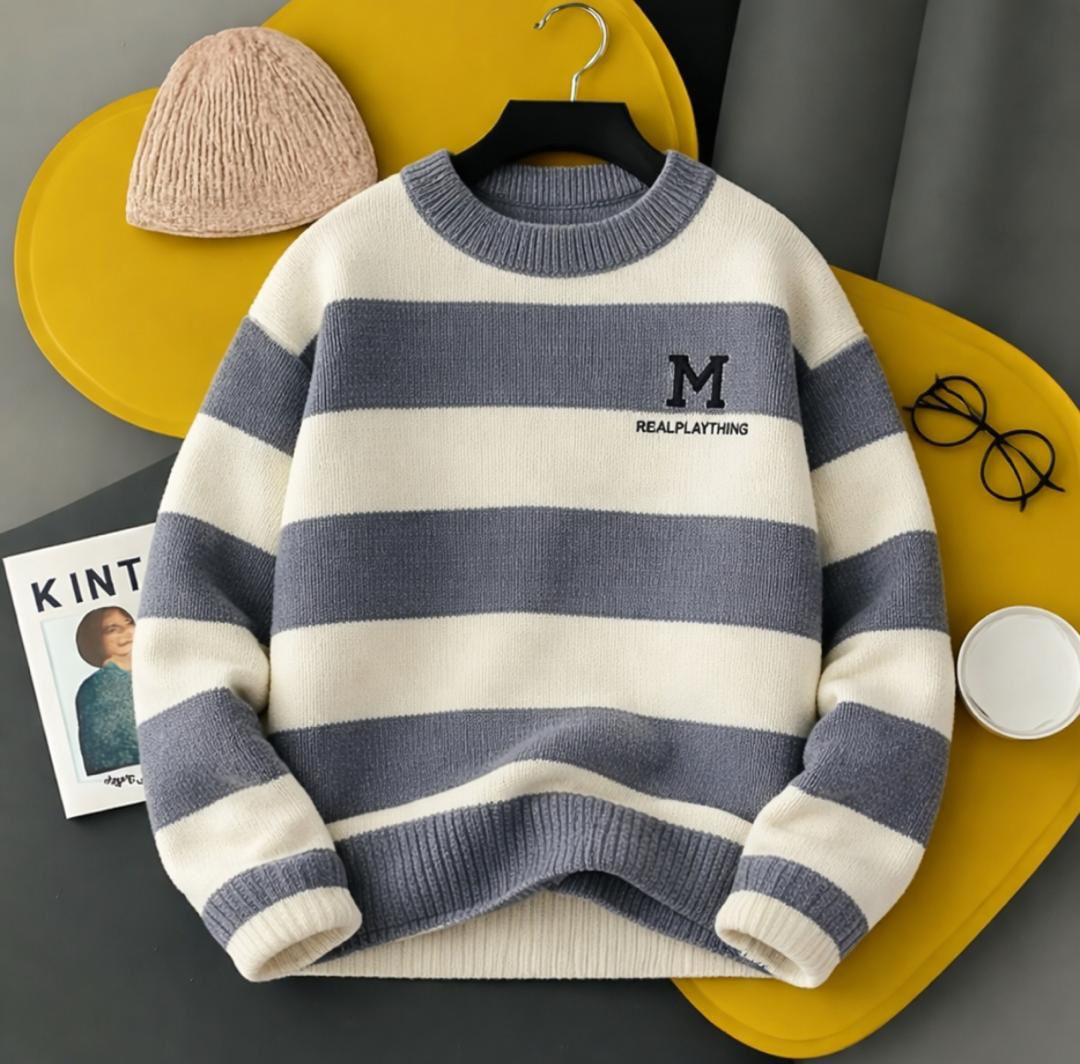Timeless cozy vibes in this ? black-white striped knit sweater! Thick ribbed texture with bold horizontal stripes, crewneck, oversized fit – perfect Lagos layering piece with subtle "M REALBEAUTYING" embroidery.