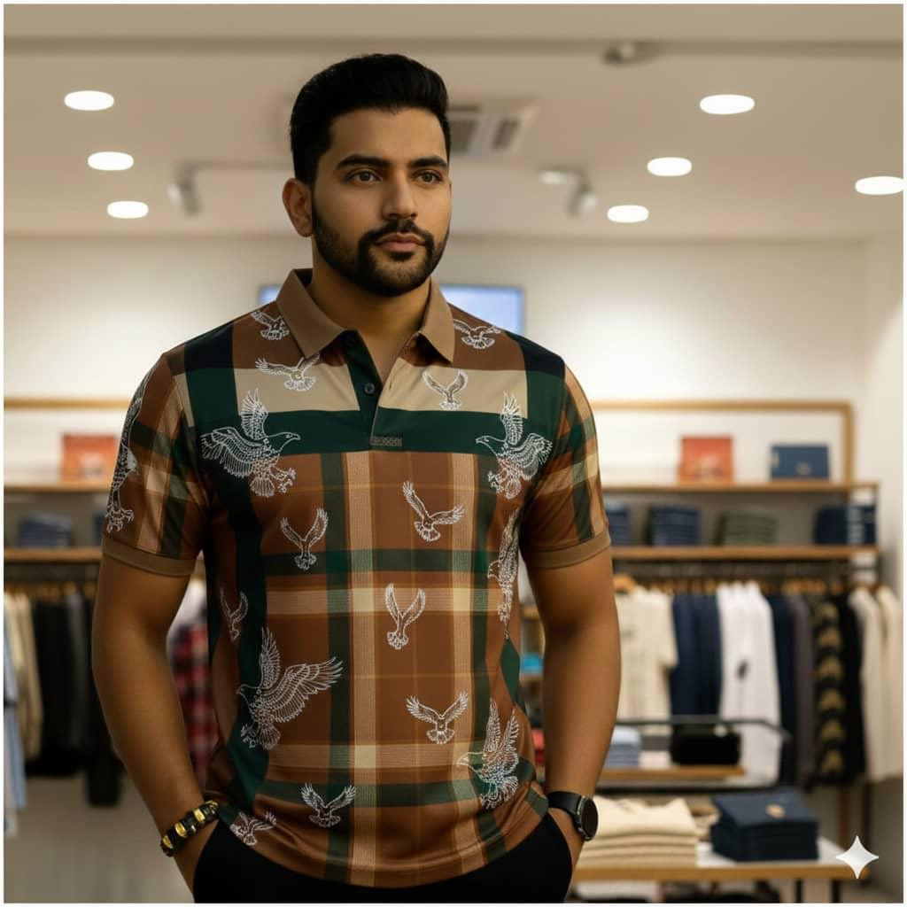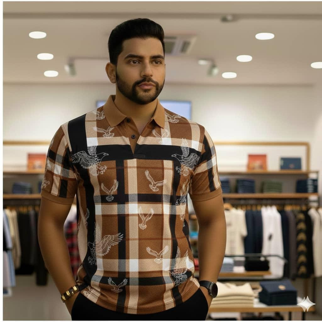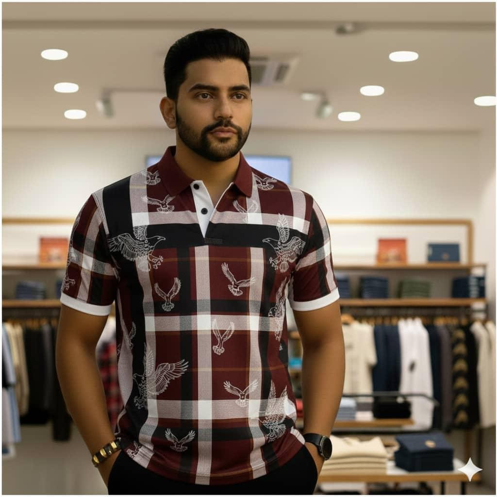Stand out with this ? burgundy plaid polo! Rich maroon/black check pattern with scattered white embroidered eagles – short sleeve, collared, perfect for Lagos casual flex.