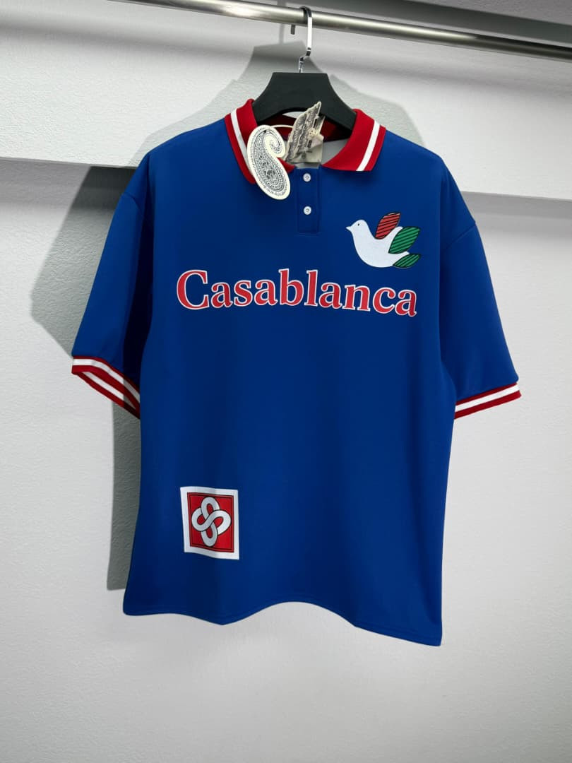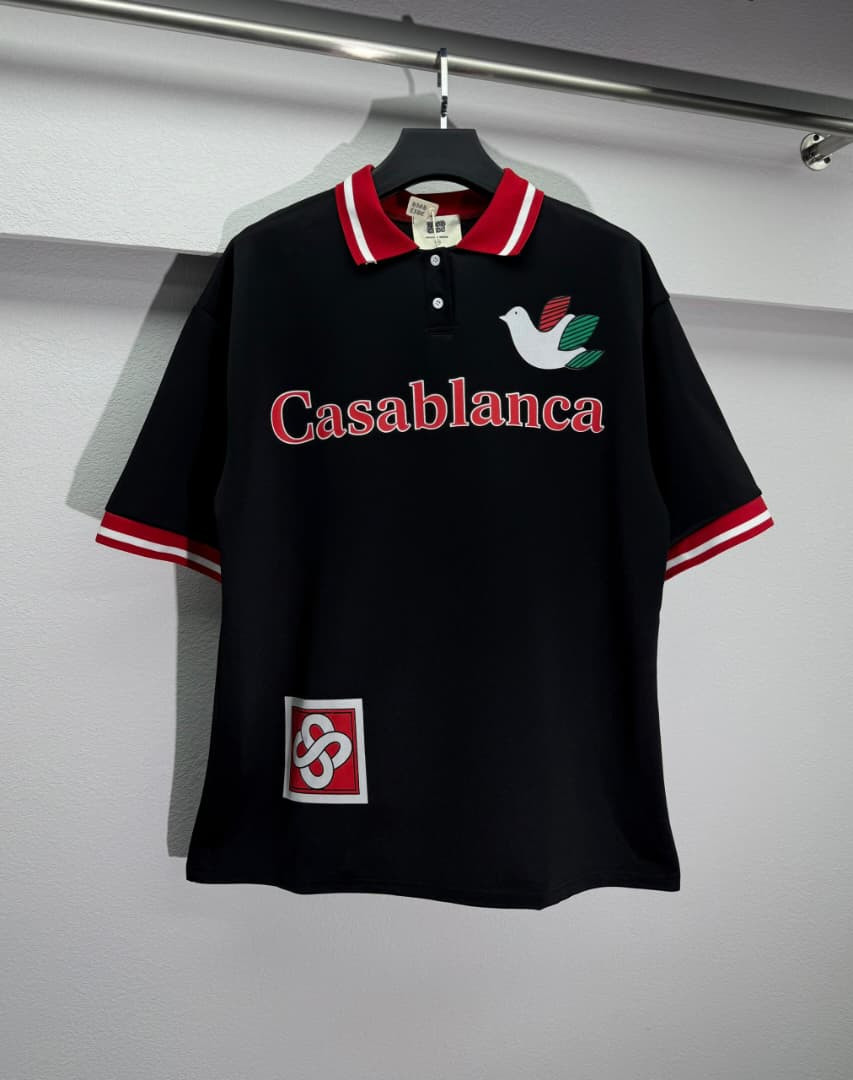 Channel dreamy luxury in this black Casablanca-inspired oversized polo shirt – loaded with signature dove and bold red script for ultimate preppy-street impact! The jet black body contrasts sharply with the white/red striped collar and ribbed cuffs/hem trim (classic retro-sporty pop), while the large red embroidered "Casablanca" script across the chest and colorful dove motif (white body, red/green wings) deliver iconic brand energy. Small red/green square patch with intertwined "∞" logo on hem adds subtle premium detail. Oversized boxy fit, dropped shoulders, longer length, half-zip placket (or button option), and lightweight breathable fabric make it ultra-comfortable and versatile—perfect for Plumstead layering under jackets in February chill or standalone with cargos/jeans/sneakers for maximalist preppy-street, vacation-luxury, or hype casual looks.