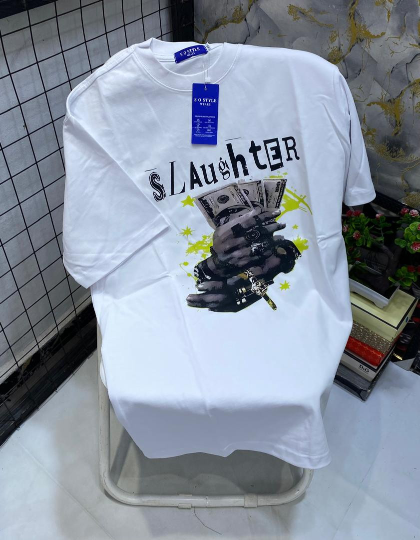 Stack the drip with this dark grey oversized graphic T-shirt – raw money energy meets neon street attitude! The deep charcoal grey cotton body contrasts hard with a massive central neon yellow/green graphic: a hand clutching a thick stack of cash, topped with dripping "SLAUGHTER" text (stylized as "S LAugh tER") in bold graffiti font, splatter effects, stars, and money motifs for insane visual pop. Relaxed boxy fit, dropped shoulders, longer untucked length, crewneck, short sleeves, and soft breathable fabric make it ultra-comfortable and versatile—perfect for Plumstead layering under hoodies/jackets in February chill or solo with jeans/cargos/sneakers for edgy hip-hop-hype, money-motif flex, Y2K-revival, maximalist streetwear, or bold casual looks.