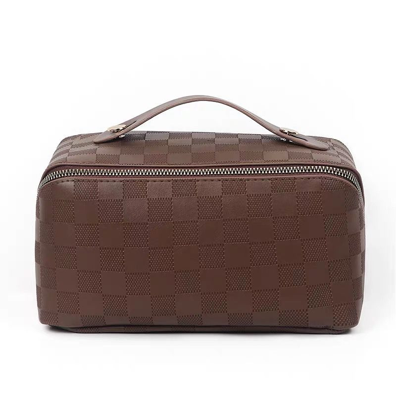 Timeless grooming essential with this ? brown Damier Ebene-inspired toiletry pouch! Classic checkered canvas in warm brown with leather trim and gold zipper – compact, structured, and perfect for travel or daily organization.