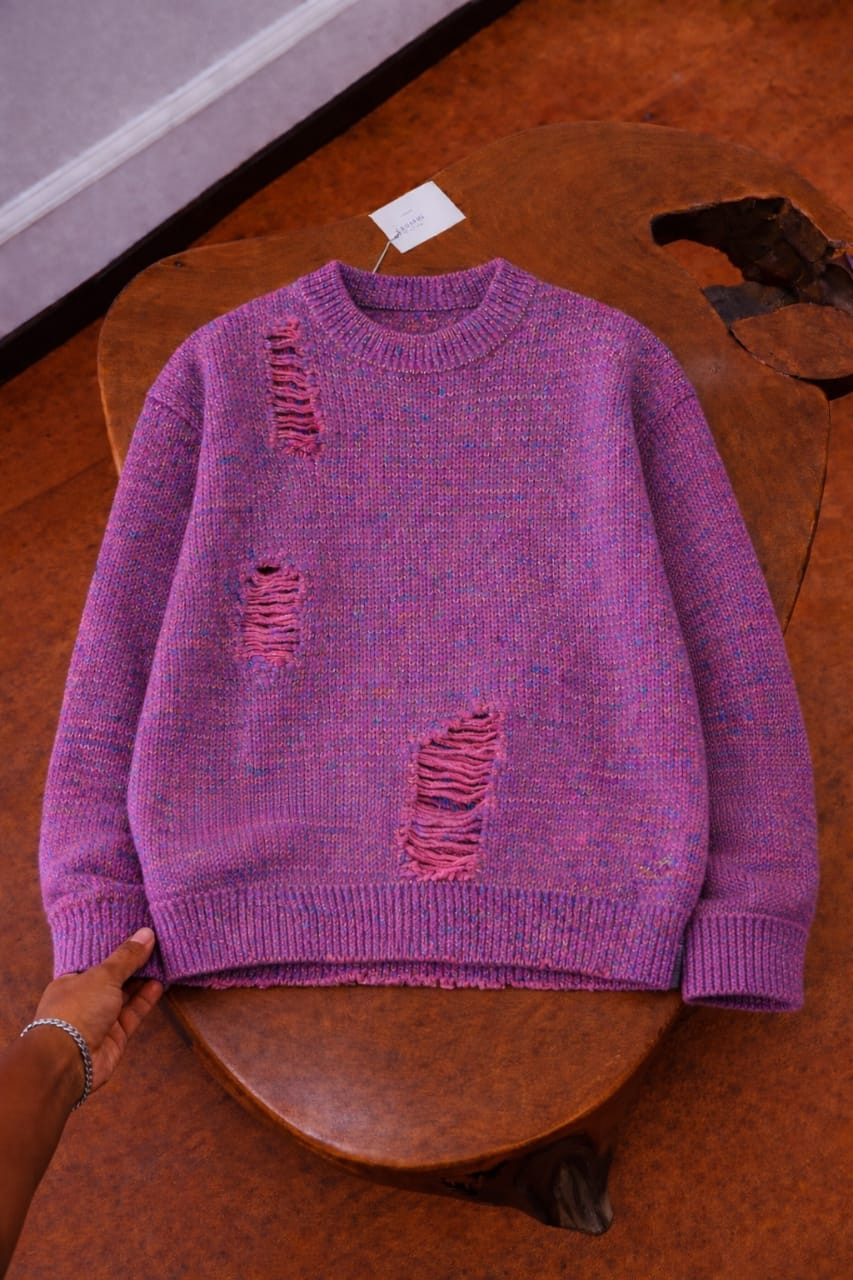 Crewneck ribbing, long sleeves, distressed throughout body/hem/sleeves