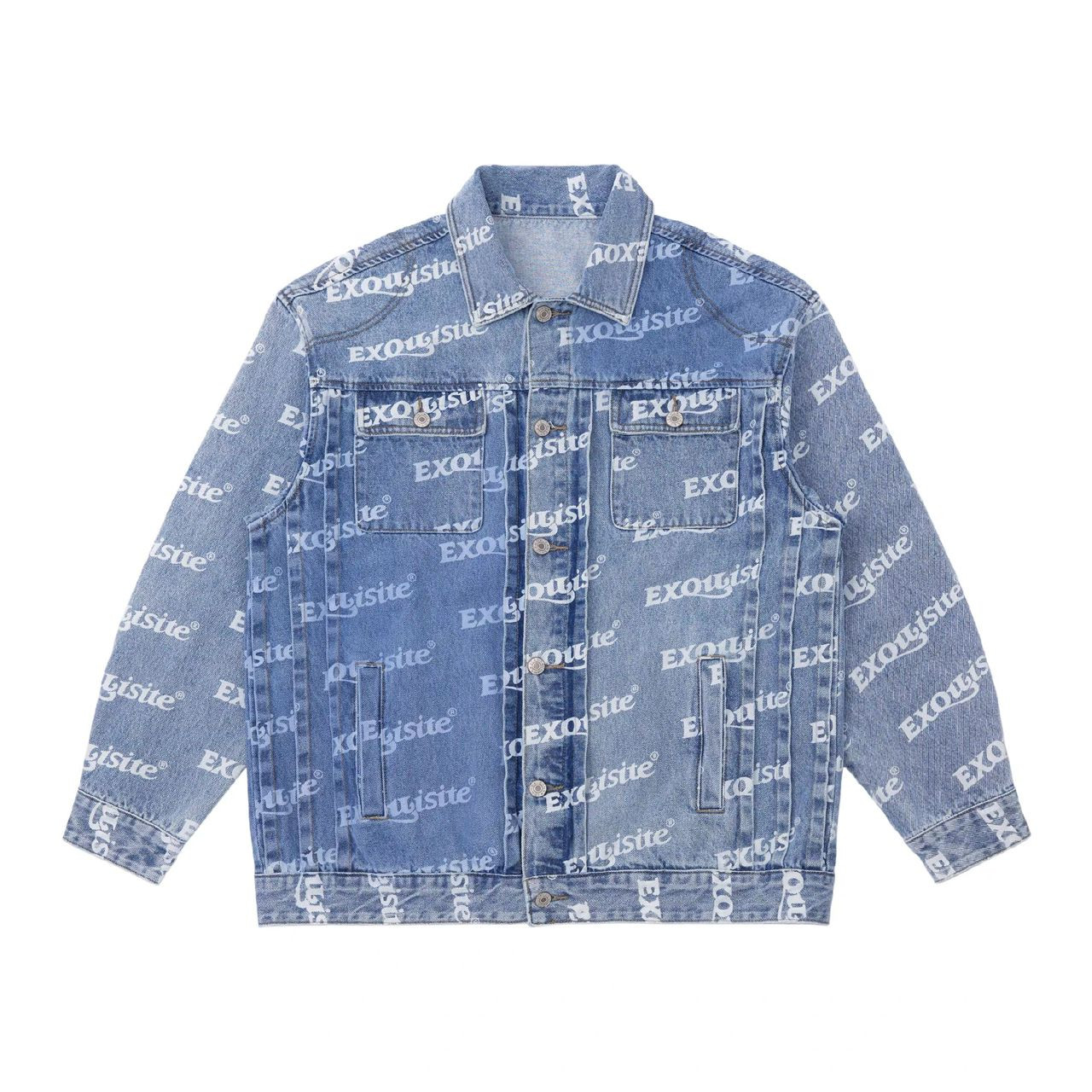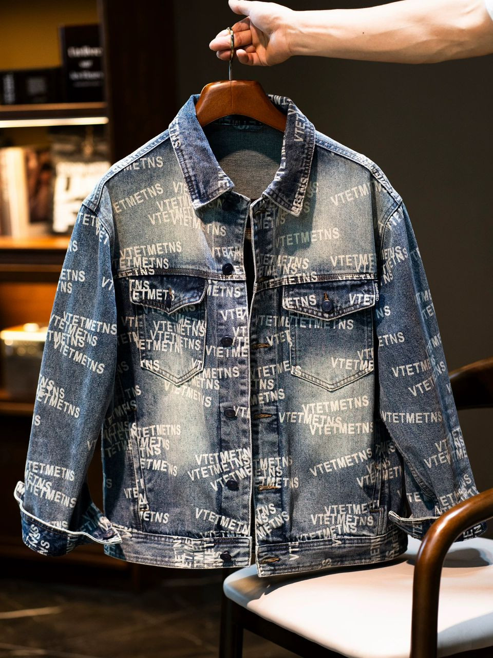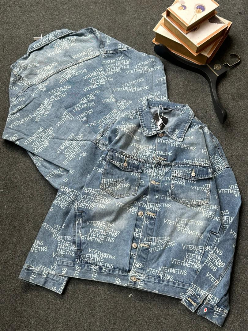 Hype streetwear essential with this ? faded blue denim jacket! All-over repeating "VTETMETNS" text print (Vetements-inspired glitch/logo mashup) on light wash denim – oversized trucker fit for bold layering.