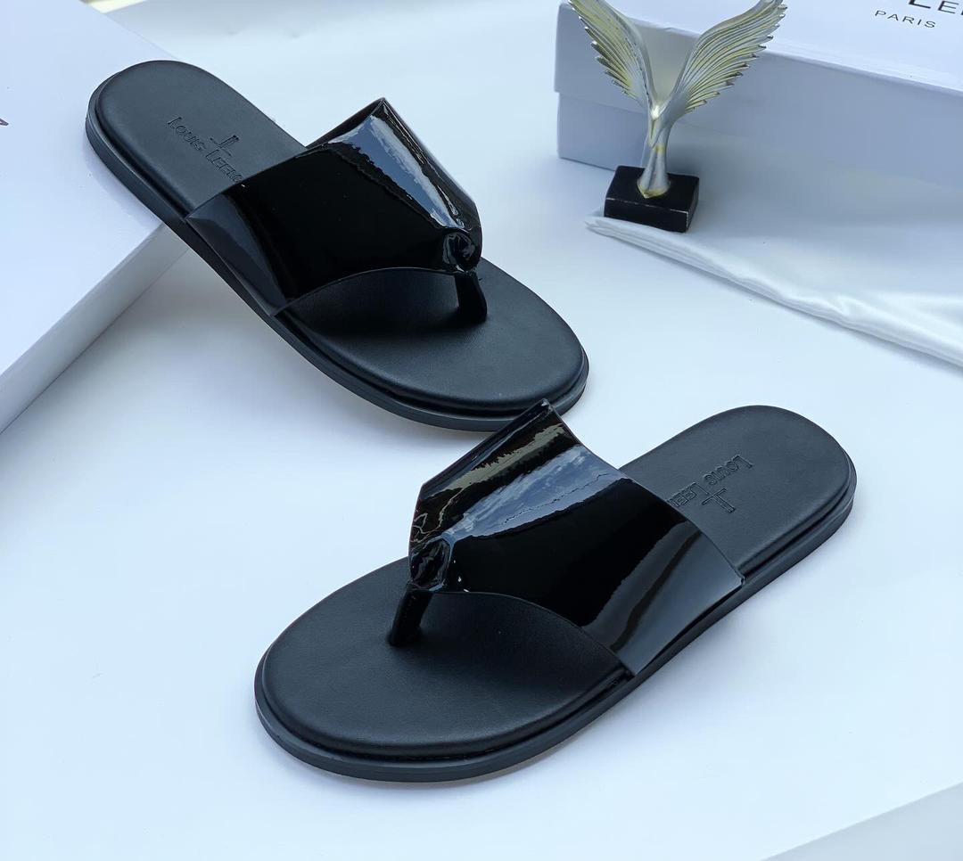 Effortless luxury in these ? white glossy thong slides! Shiny patent-like upper with wide toe-post strap, flat black sole for comfort and subtle lift – sleek, minimalist vibe perfect for Lagos heat.