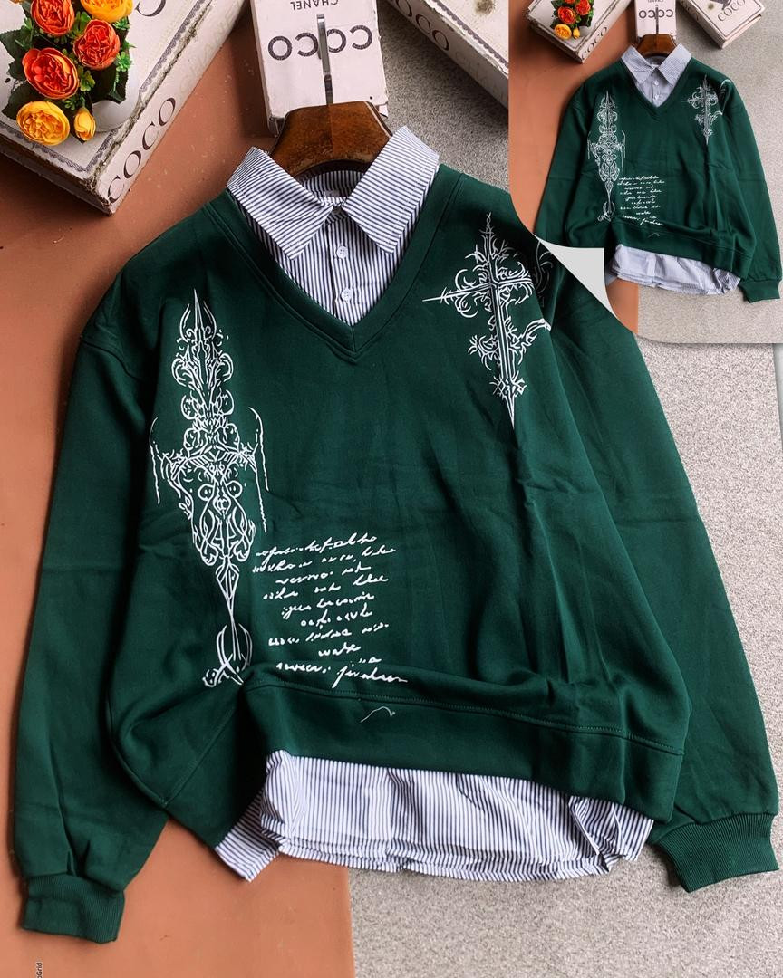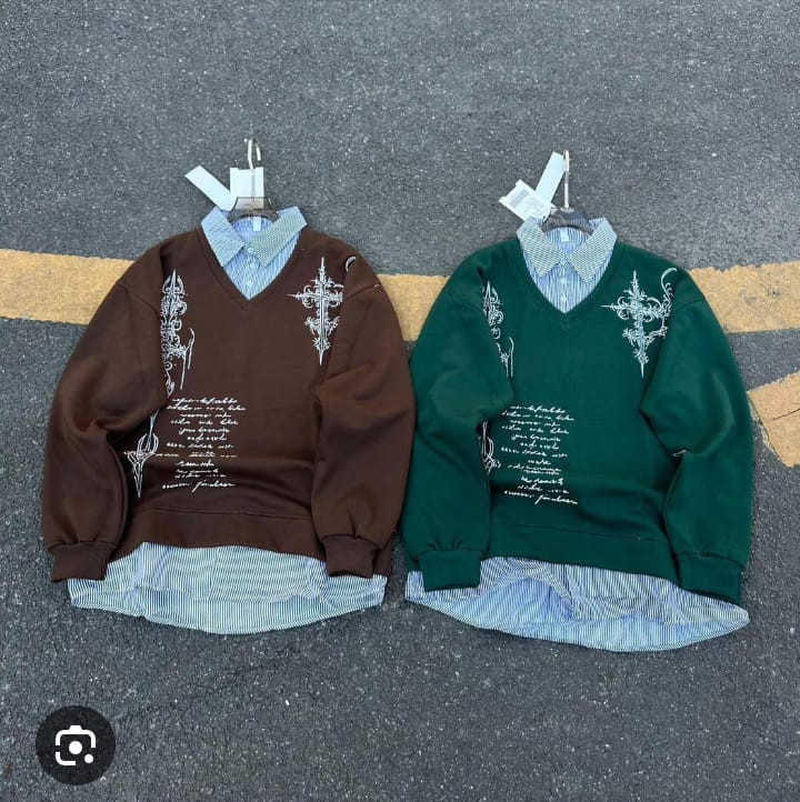 Heavy Lagos street energy with these fake layered gothic sweatshirts – oversized with built-in striped shirt illusion + bold cross embroidery and Latin script!