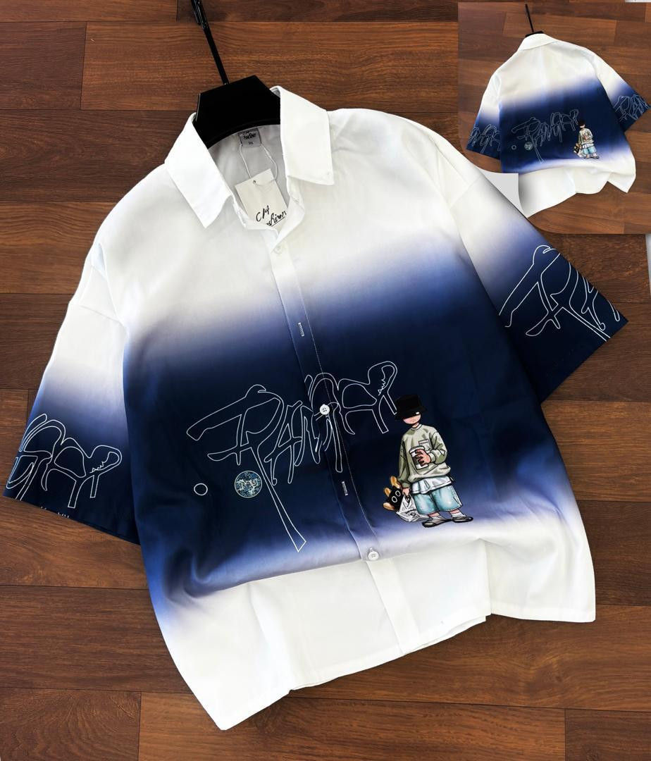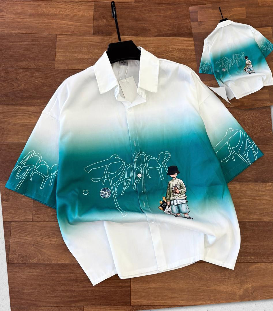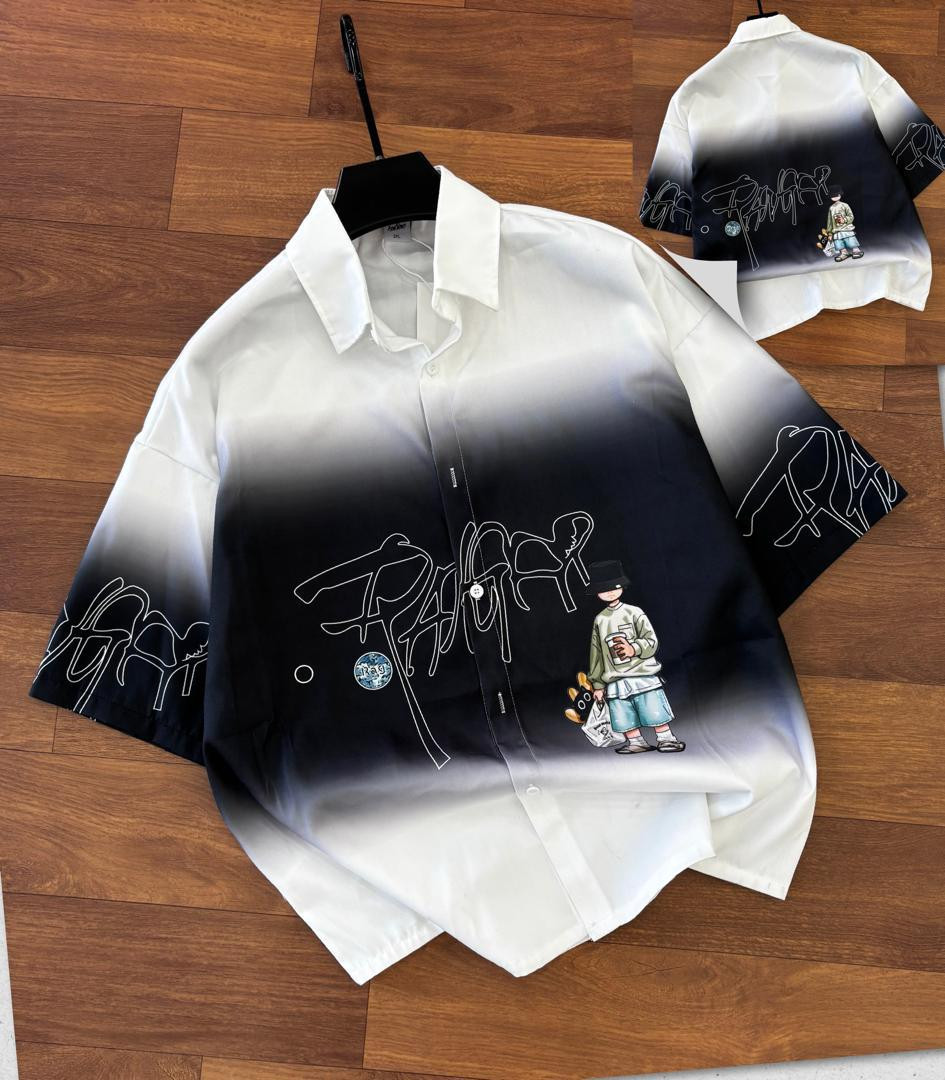 Level up your drip with this white-to-yellow gradient button-up shirt – anime vibes meet bold ombre for instant street heat! The smooth white-to-bright yellow fade (top clean white, bottom vibrant yellow tie-dye/ombre effect) creates a fresh, eye-catching base, while the front features a cute cartoon boy in bucket hat holding a camera/coffee bag (chibi/anime style with playful details), surrounded by "PAIDY" or graffiti-style text tags. Matching "PAIDY" outline prints on back/yoke/sleeves and small circular logo patch add layered hype. Spread/open camp collar, full button-front, short sleeves, oversized boxy fit with dropped shoulders, longer untucked length, and lightweight breathable satin/poly fabric with subtle sheen make it ultra-versatile—perfect for Plumstead wearing open over tees with cargos/jeans/sneakers in mild February weather or buttoned for Y2K-revival, anime-hype, maximalist streetwear, playful vacation, or bold casual flex.
