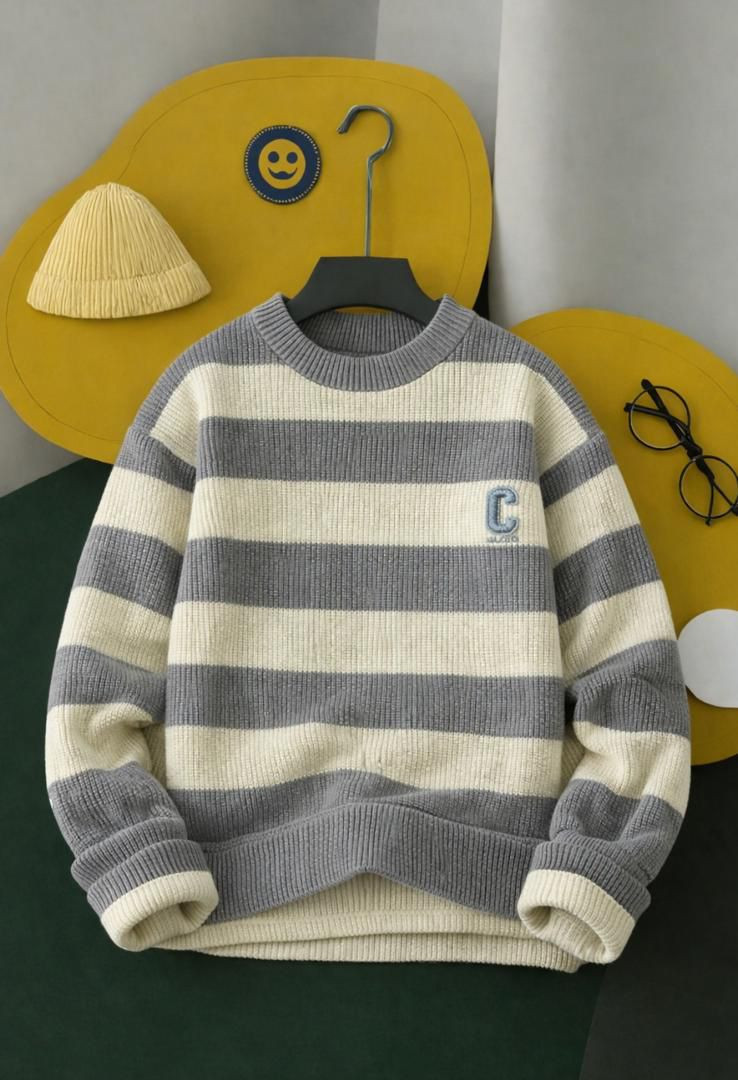 Cozy neutral vibes in this ? gray-cream striped knit sweater! Thick ribbed texture with wide horizontal stripes, crewneck, oversized fit – perfect Lagos layering piece with subtle "C" embroidery.