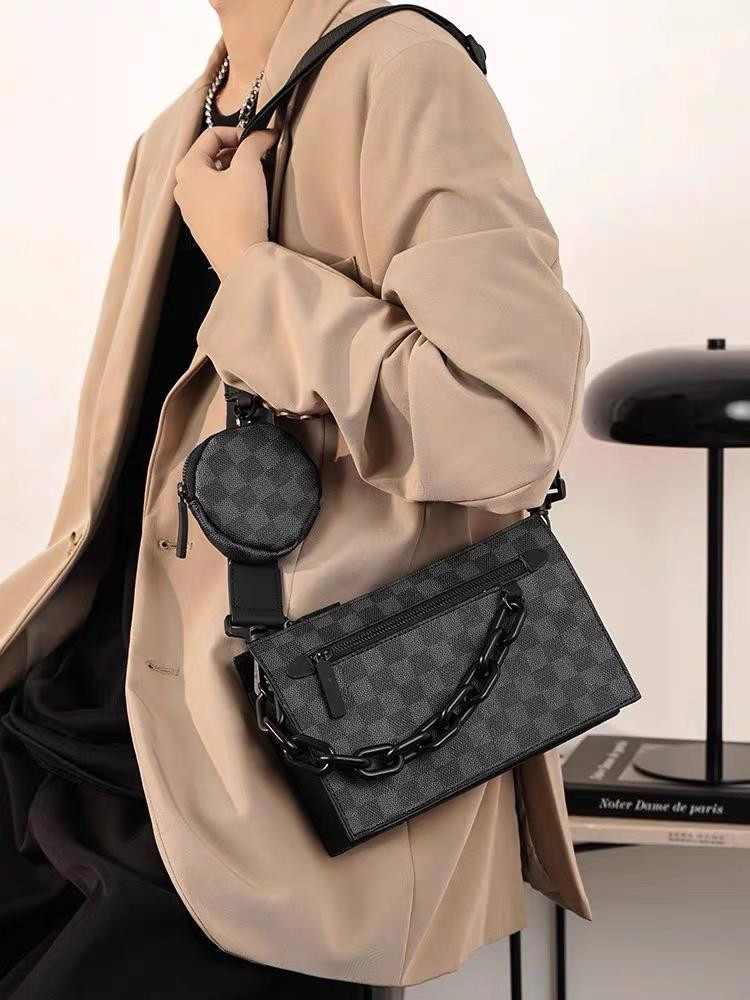 Black chain strap + detachable pouch – edgy detail + extra utility