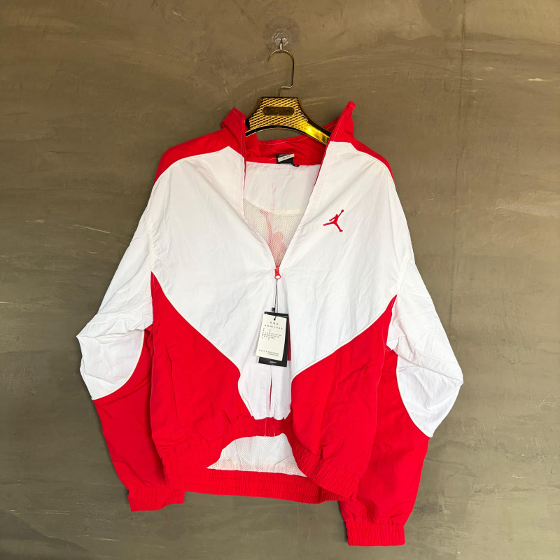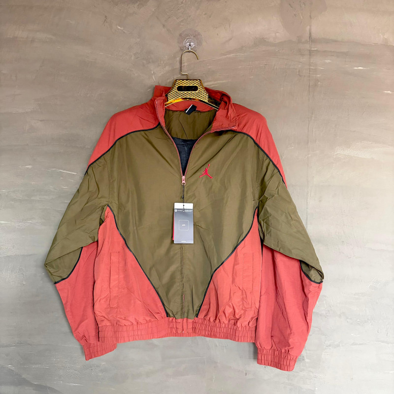 Retro-inspired Jordan-style windbreaker jacket in eye-catching olive green and red colorblock – lightweight, sporty, and perfect for streetwear, casual outings, or light weather protection!