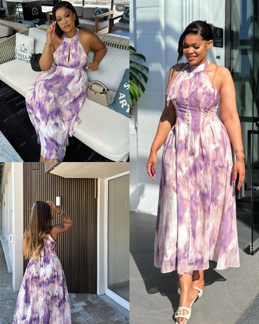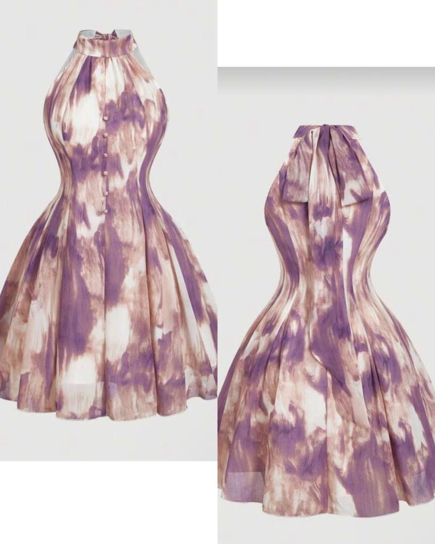 Dreamy romance in this ? lavender tie-dye halter mini dress! Soft watercolor print in purple tones, high halter neck with open back and satin bow, fitted bodice + flared skirt – ultimate feminine party look for Lagos vibes.