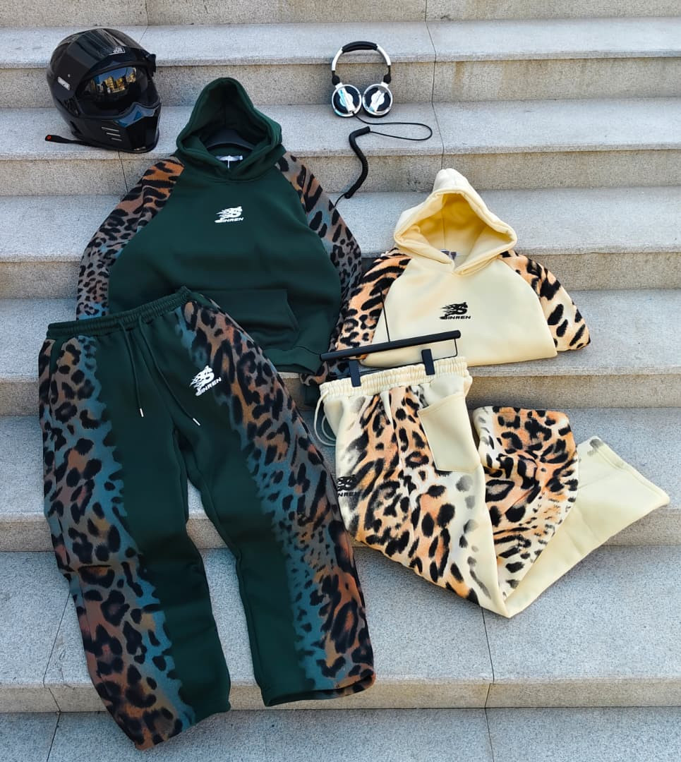 Wild energy in this ? leopard fade tracksuit set! Oversized green or yellow hoodie with raglan leopard sleeves + matching joggers – SHINREN logo flex for Lagos streetwear.