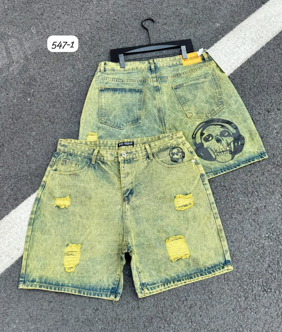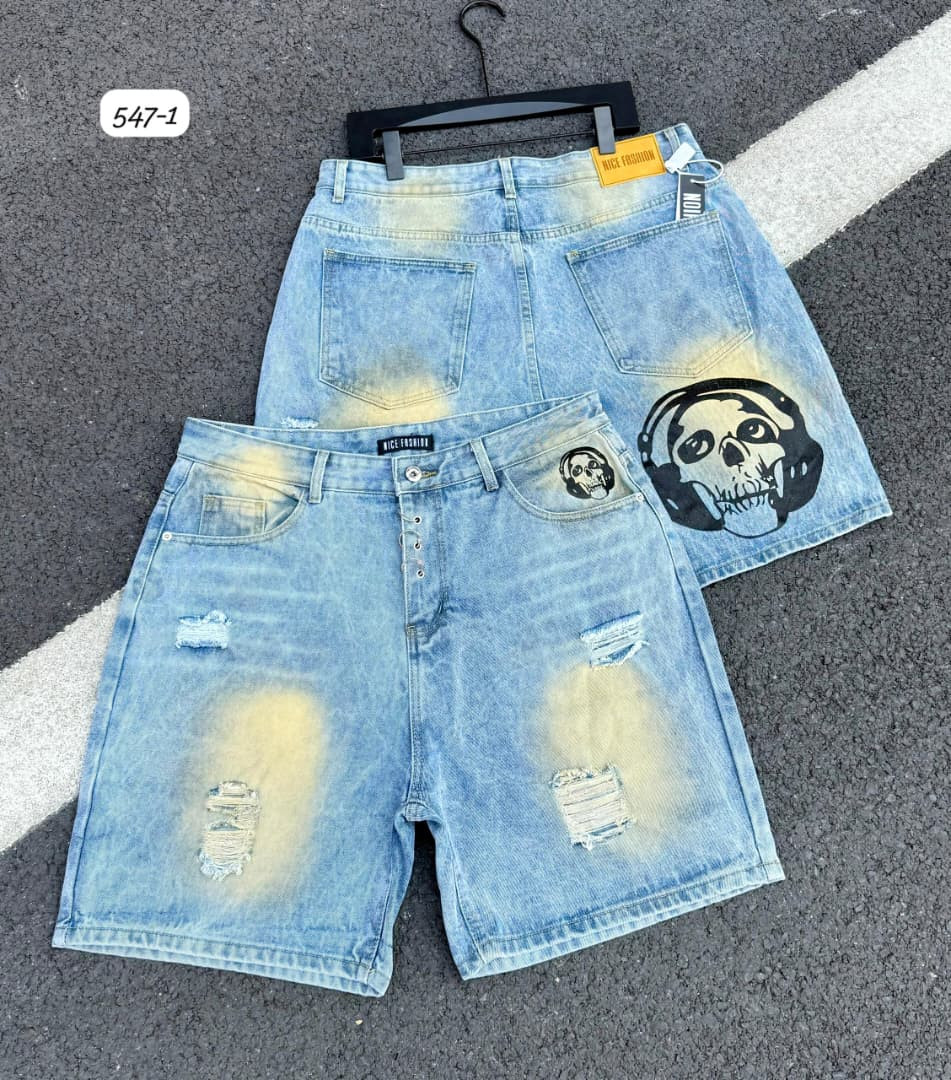 Edgy street flex in these ? light-bleach distressed denim shorts! Baggy fit with heavy fade/bleach spray, ripped details, and bold skull-with-headphones airbrush print on back pockets – ultimate grunge/hip-hop vibe for Lagos looks.