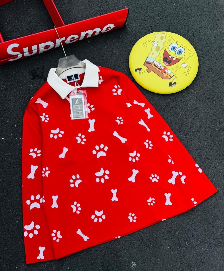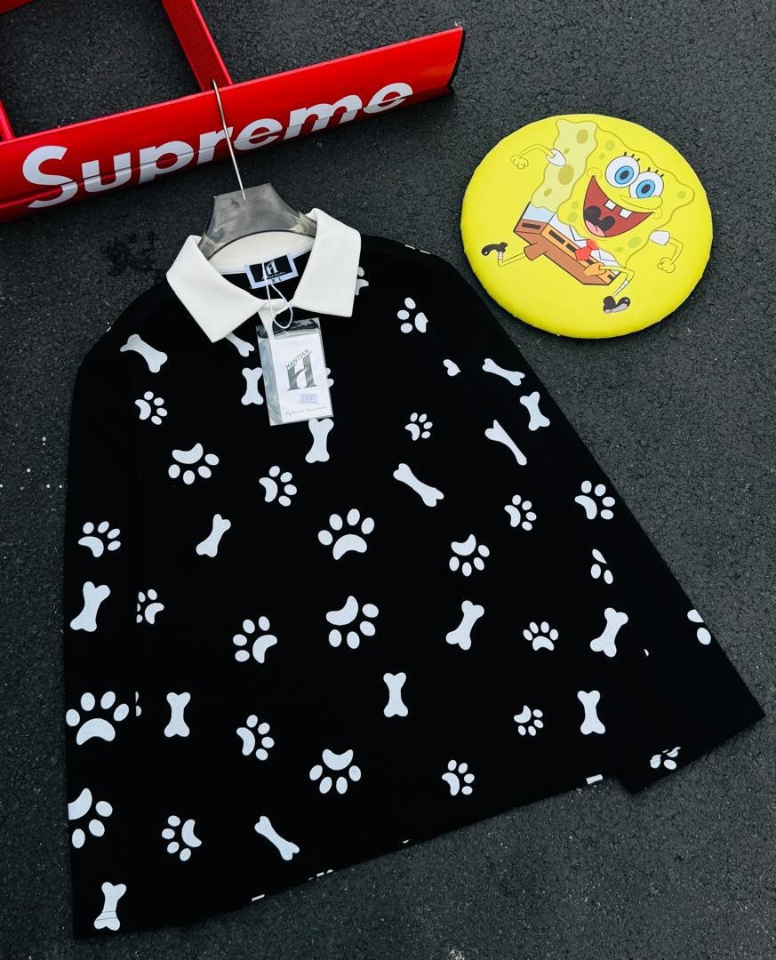 Add a playful yet stylish touch to your wardrobe with this Paw & Bone Print Long-Sleeve Polo. Featuring a unique all-over pattern and a sharp contrast collar, this shirt is designed for those who love bold, streetwear-inspired fashion.