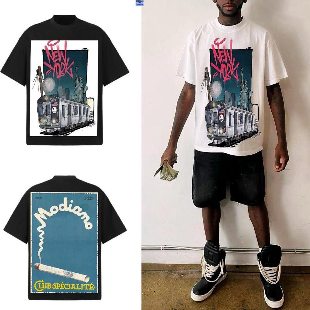Capture the heartbeat of NYC with this dual-sided graphic tee. Featuring a high-detail New York subway and Statue of Liberty front print with vibrant graffiti accents, and a vintage "Modiano Club-Spécialité" retro poster on the back, this shirt is a fusion of street culture and timeless design.