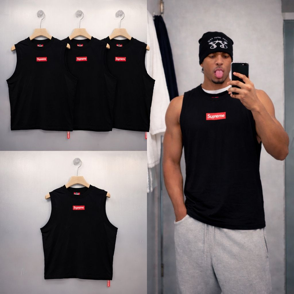 Keep it classic with this sleek black muscle tee. Featuring a centered red box logo, this sleeveless shirt is perfect for layering or wearing solo. Designed with a clean, high-contrast aesthetic that never goes out of style.