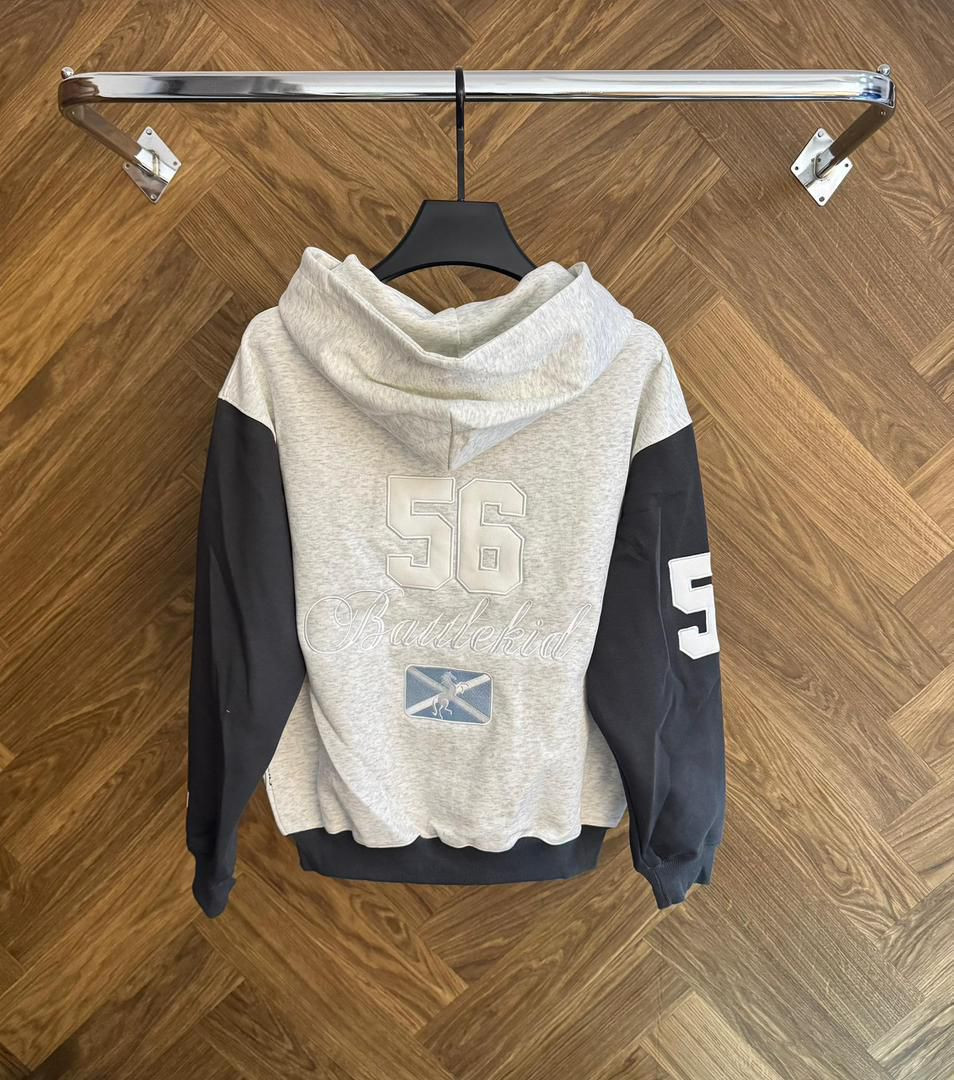 Upgrade your layering game with this sophisticated "Barlekid" varsity zip-up. Blending traditional heraldic symbols like the unicorn and cross with a modern two-tone color block design, this hoodie offers a premium, structured look for the fashion-forward individual.