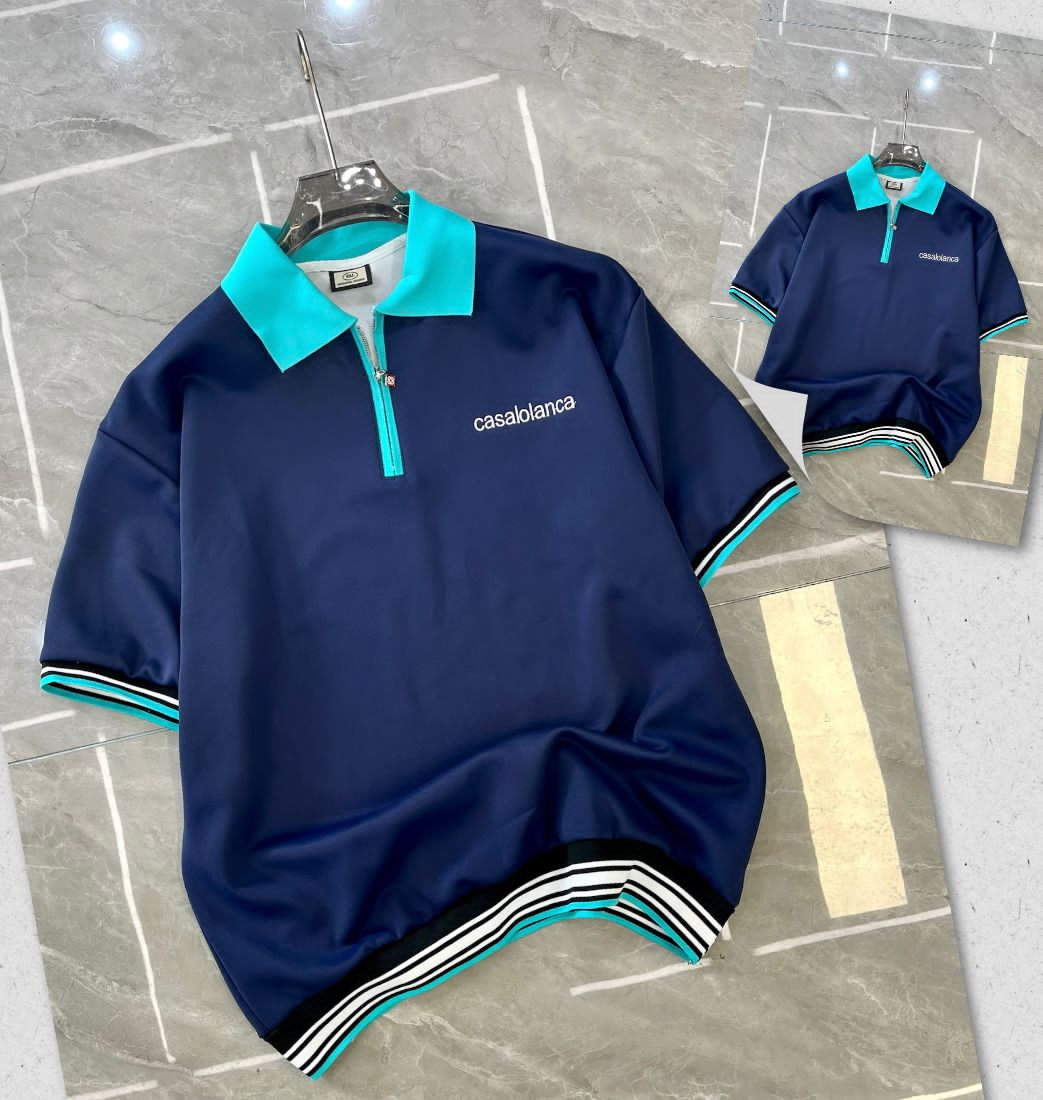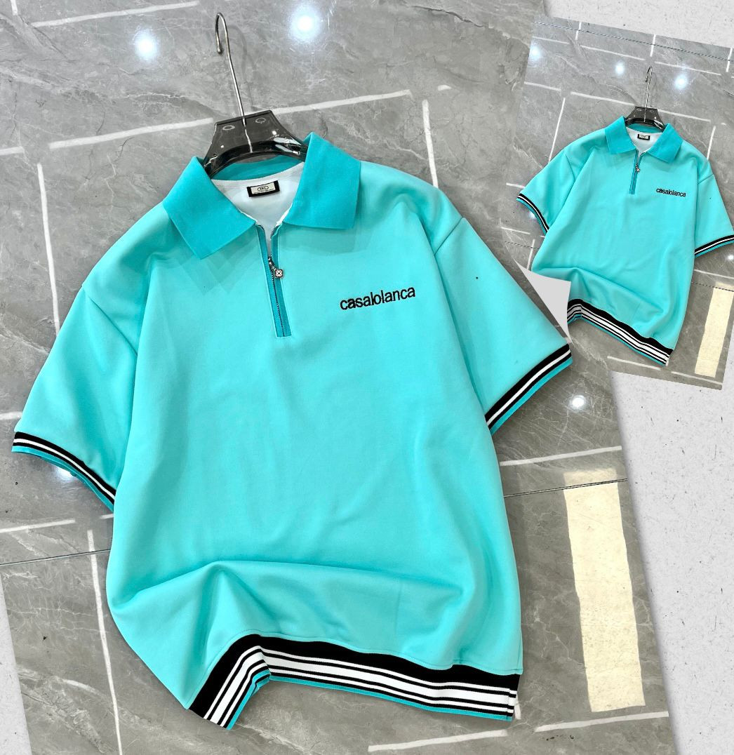 Bring vacation luxury to your everyday rotation with this turquoise/teal mint Casablanca-inspired oversized polo shirt – fresh, retro, and effortlessly cool! The bright mint base contrasts beautifully with the multi-striped collar (black/white with orange trim for classic 80s/90s sporty energy) and a small chest print/embroidery of "casablanca" in sleek lowercase black script – pure escapist high-fashion casual vibes. Lightweight, smooth fabric with a relaxed boxy fit, dropped shoulders, longer length, half-zip/button placket, ribbed cuffs, and side slits make it ultra-comfortable and versatile—perfect for Plumstead layering or standalone summer/preppy looks.