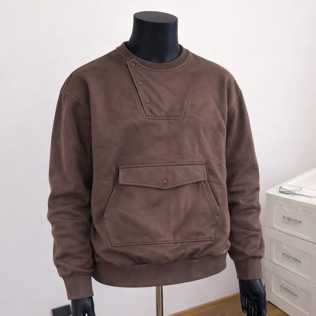 Mock crewneck + 3-snap placket – modern, functional detail