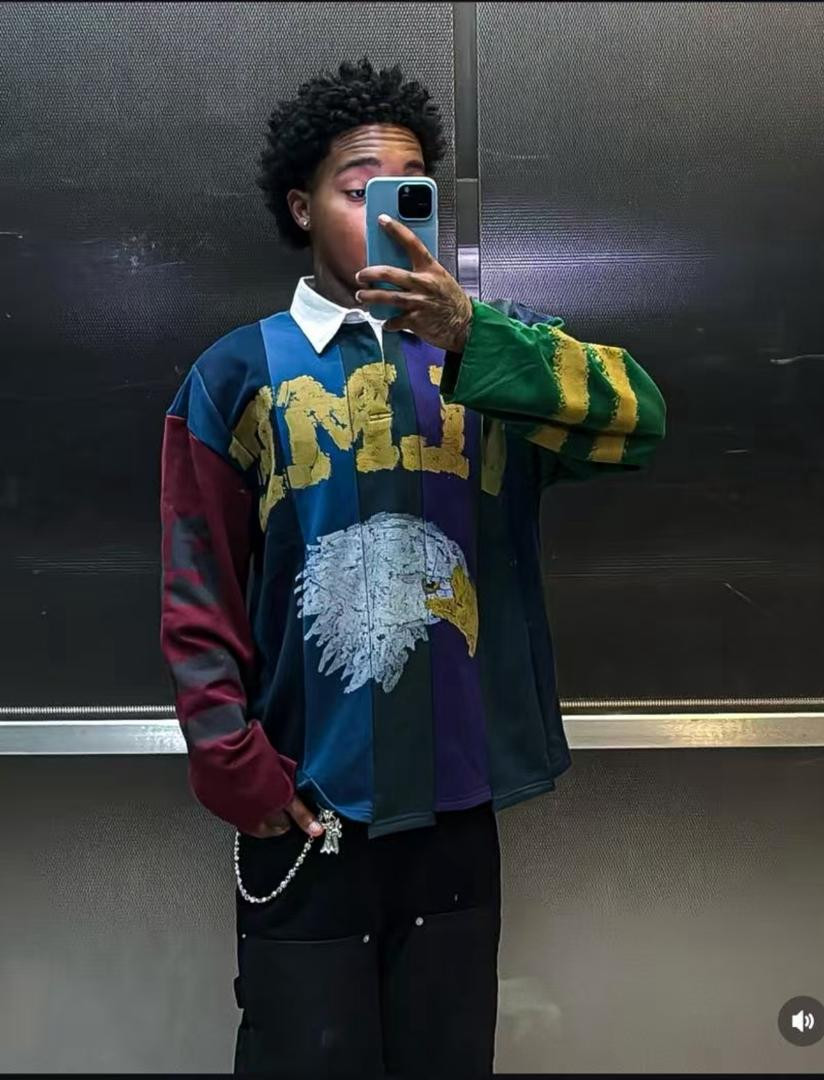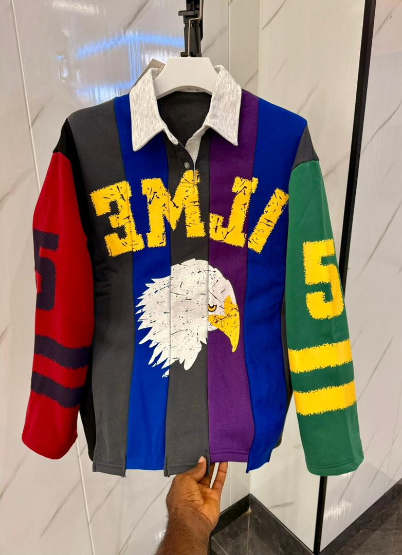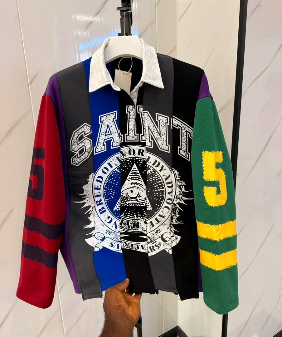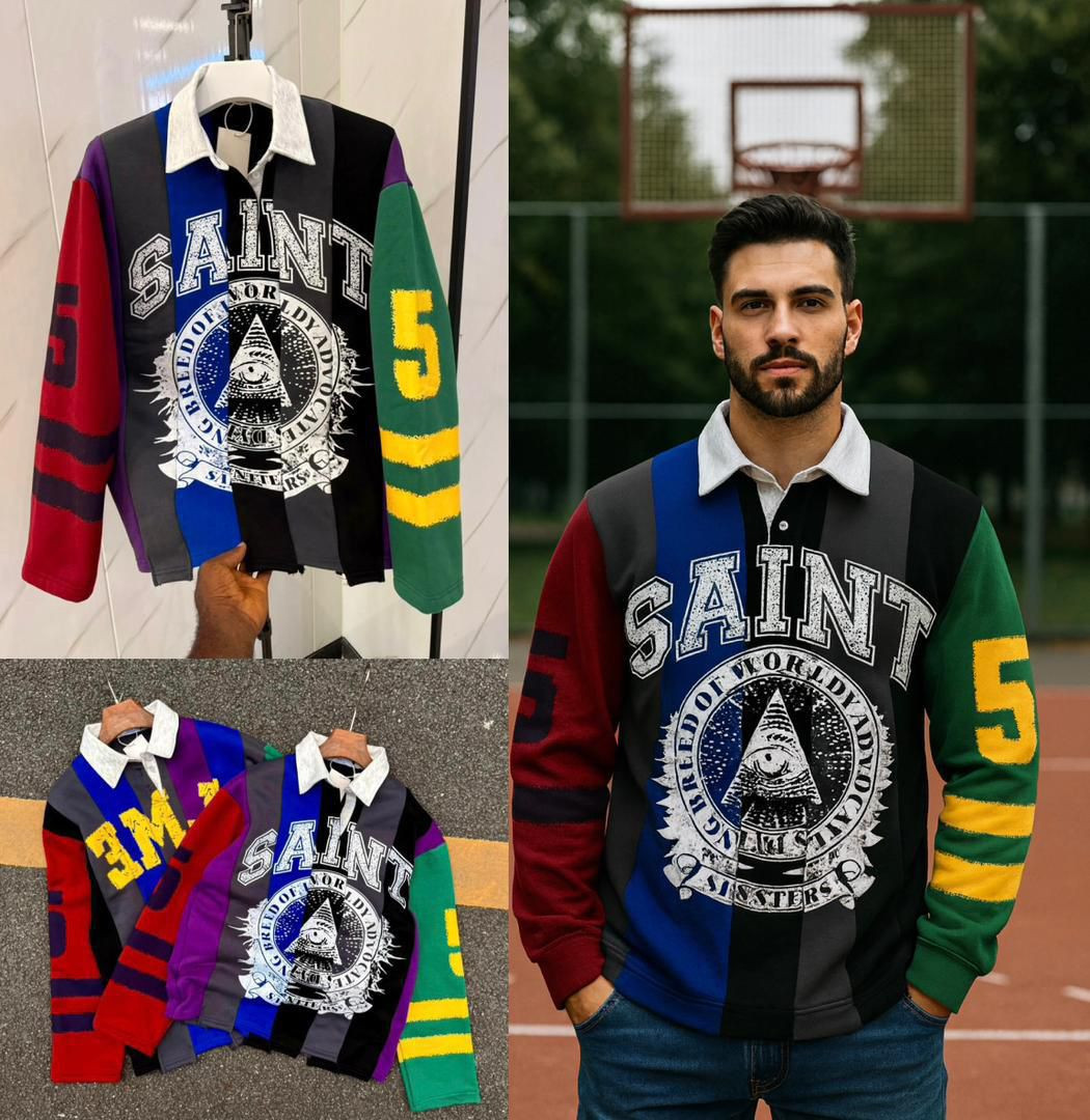 Level up your flex with this ? multicolored rugby polo! Heavyweight cotton in patchwork panels (red, purple, green, black, blue) with massive "SAINT" chest print over all-seeing eye pyramid emblem and occult text overlays – ultimate streetwear energy for Lagos vibes.