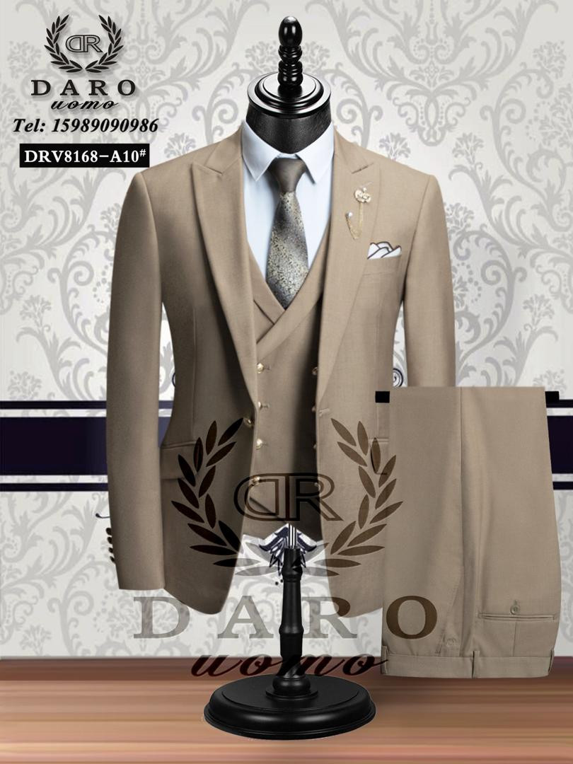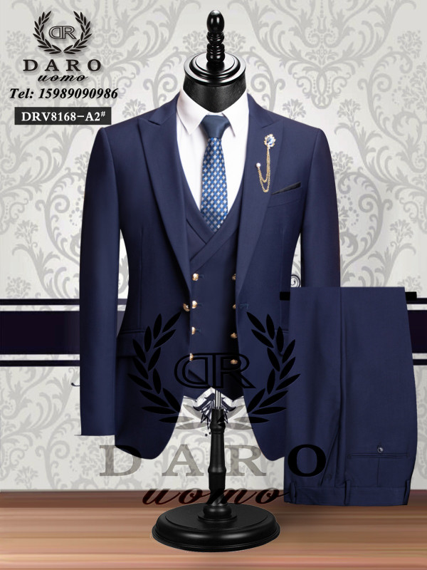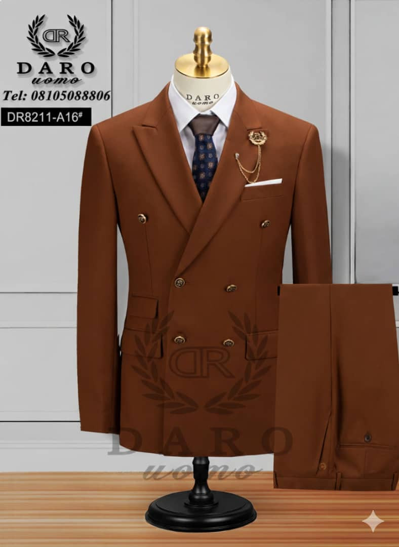 Command attention in this navy blue 3-piece double-breasted suit from DARO uomo – timeless elegance meets modern luxury tailoring! The deep midnight navy wool-blend fabric offers flawless drape and year-round comfort, while the double-breasted 6x2 gold button design, wide peak lapels, padded shoulders, flap hip pockets, jetted chest pocket with white pocket square, and gold lion/crest lapel chain pin deliver powerful sophistication. The matching 5-6 button waistcoat/vest cinches the silhouette, and the slim-tapered trousers complete the polished look – perfect for Lagos weddings, owambe parties, church events, corporate functions, or upscale celebrations.