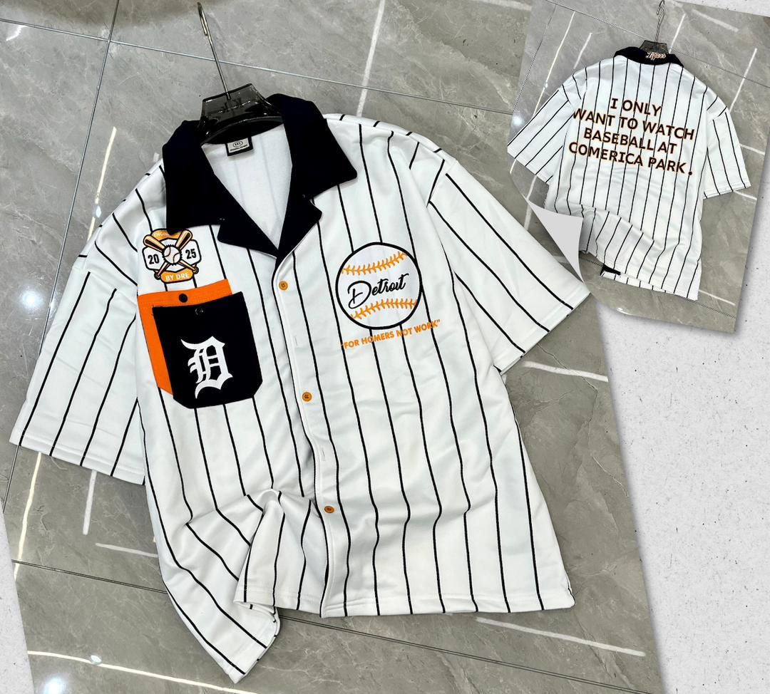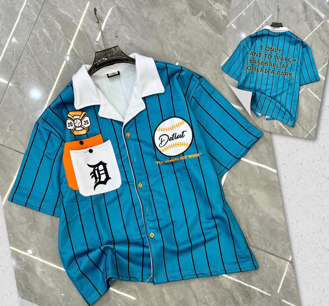 Rep Detroit Tigers in ultimate street style with this navy/white pinstripe baseball button-up shirt – oversized, nostalgic, and loaded with fan energy! The classic navy pinstripe base (iconic Tigers uniform vibe) features a large central white baseball graphic with orange "Detroit" script, bold "FOR HOMERS NOT WORK" slogan below, orange chest pocket with black "D" logo, fireman's axe/crossed bats patch ("10 x 25" detail), and massive back print "I ONLY WANT TO WATCH BASEBALL AT COMERICA PARK" for full stadium devotion. Camp/revere collar, full button-front, short sleeves, oversized boxy fit, dropped shoulders, longer untucked length, and side slits make it ultra-comfortable and versatile—perfect for Plumstead layering open over tees with jeans/sneakers in mild February weather or buttoned for retro-sports, hype-fan, preppy-street, or casual baseball flex.