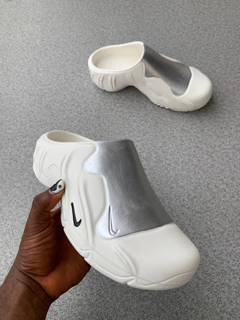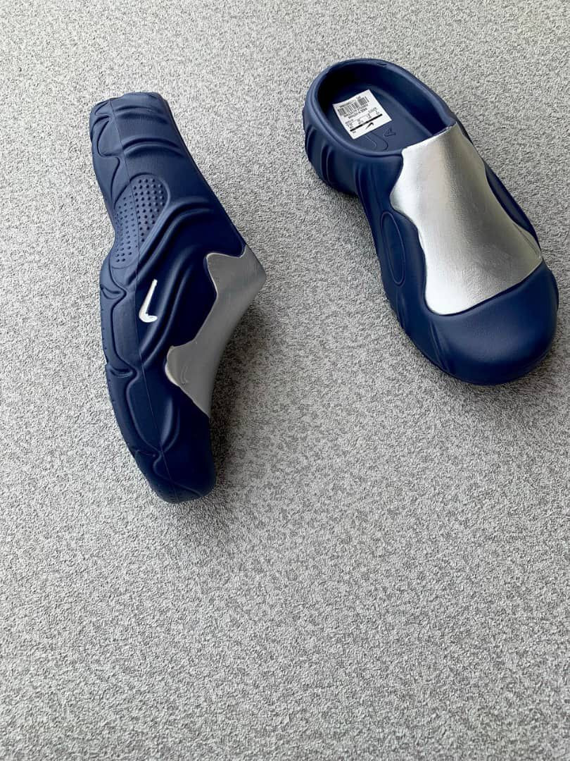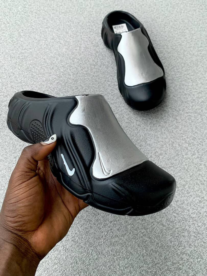 Hype Lagos summer vibes with these Foamposite-inspired slides – navy blue wavy foam upper + metallic silver toe cap for bold, comfy flex!