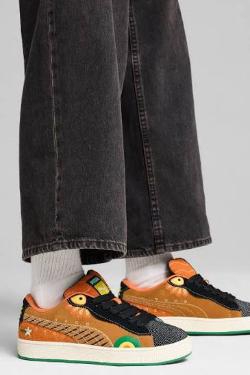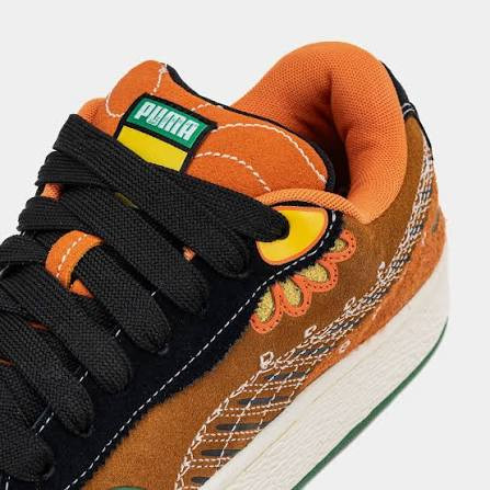Vibrant street energy in these ? Puma Palermo customs! Orange suede/mesh upper with bold black overlays, colorful eye/circle/tribal graphics, and chunky sole – ultimate cultural hype flex for Lagos outfits.