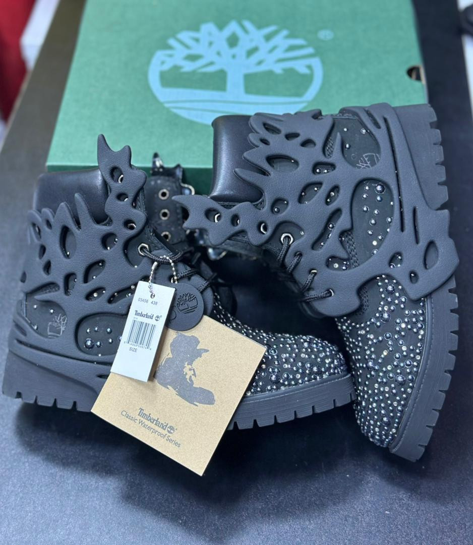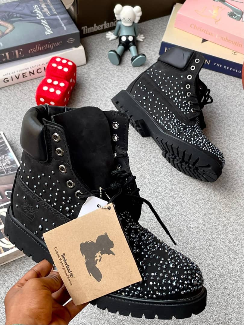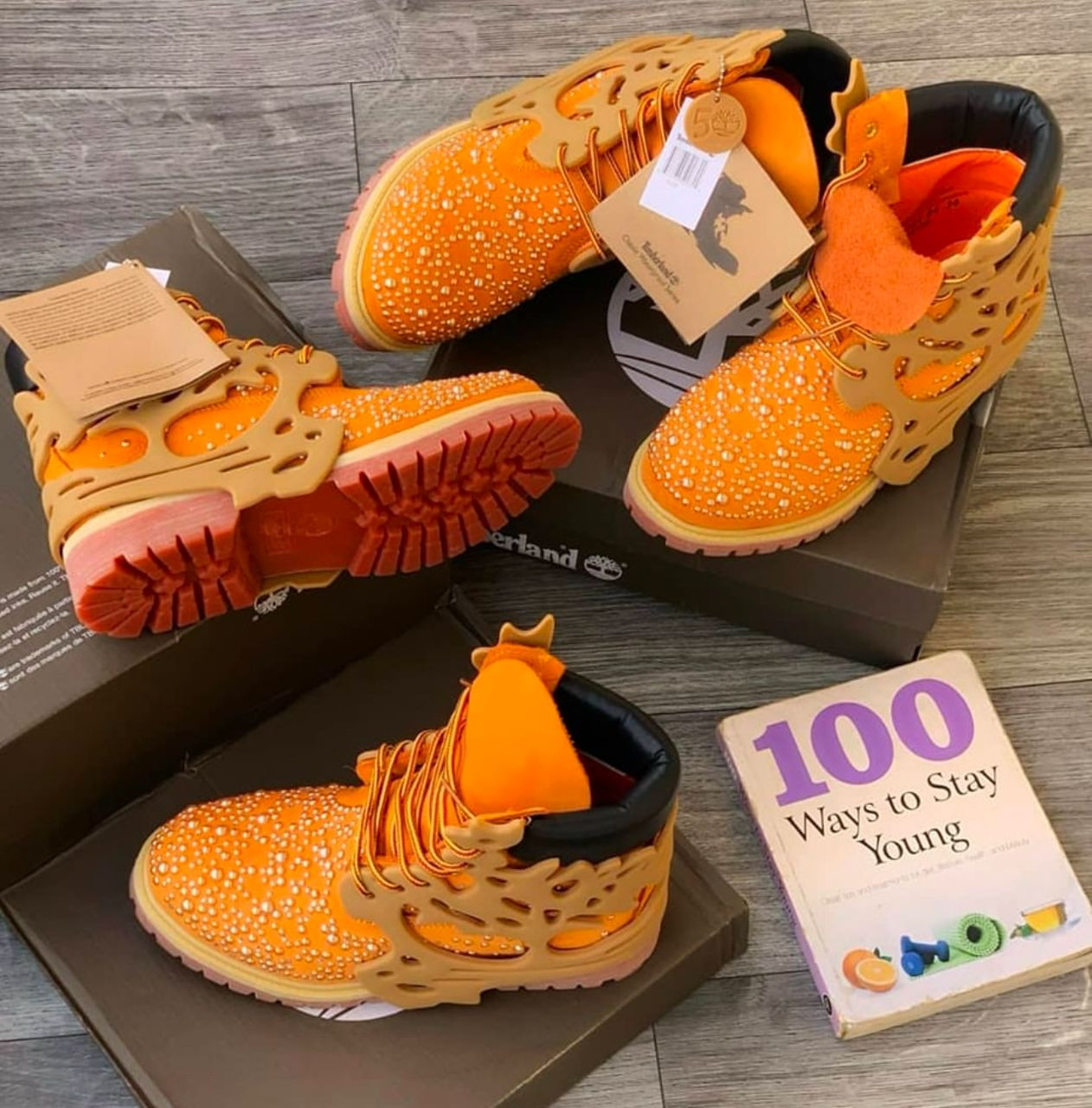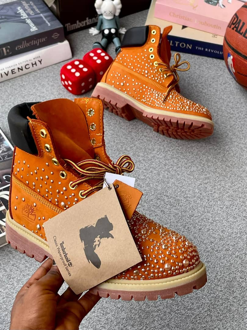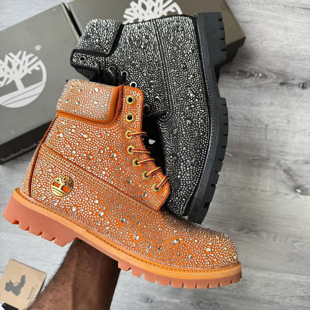 Shine brighter than the rest with these fully rhinestone-encrusted orange Timberland-inspired 6-inch premium boots – the ultimate iced-out luxury streetwear flex! The bright orange base is completely covered in high-density clear/white rhinestones/crystals for a dazzling, diamond-like sparkle from every angle, paired with gold-tone hardware (eyelets, lace hooks, side emblem) and matching orange laces. The classic 6-inch waterproof boot construction underneath delivers rugged durability, padded comfort, and the iconic orange lug sole with deep tread for grip—perfect for Plumstead's chilly February streets or turning heads year-round.