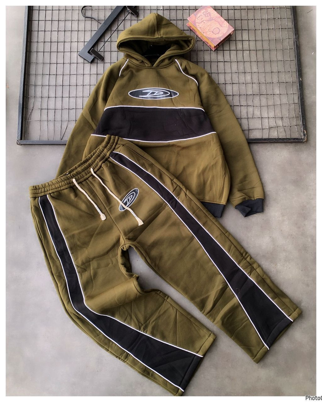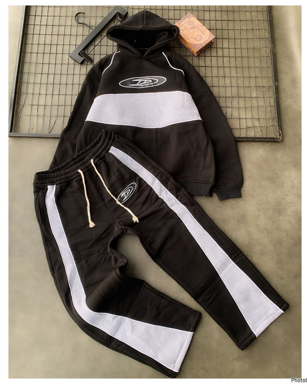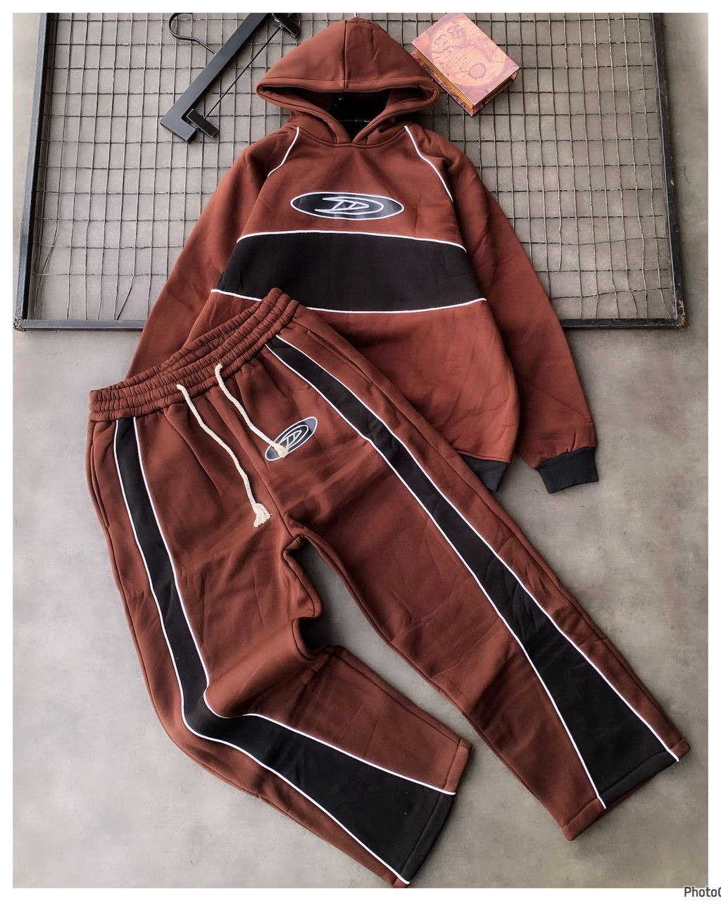 Get that premium streetwear energy with this 2-piece tracksuit set – featuring a bold oversized hoodie and matching tapered joggers! The dark brown/black base pops with wide white/grey horizontal stripes across the chest and thick white side stripes down the pants, plus a standout white oval 'D' logo printed on the hoodie front and pants leg for that iconic athletic-luxury vibe. Perfect for NYC winters—cozy fleece fabric keeps you warm during February chills, while the relaxed fit makes it ideal for layering, gym runs, or casual hangs.