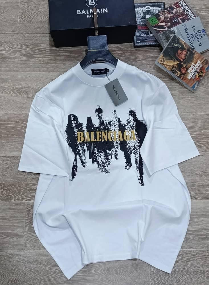 Make a statement with this ? white oversized Balenciaga-inspired tee! Crisp white cotton with bold black dripping silhouette figures and shiny gold "BALENCIAGA" text – edgy streetwear flex for Lagos vibes.