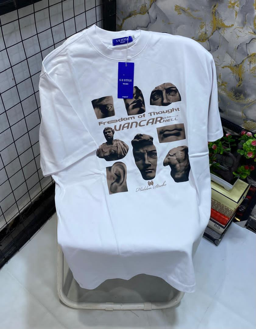 Channel deep artistic energy with this white oversized graphic T-shirt – a bold fusion of classical sculpture and modern street philosophy! The clean white cotton body serves as canvas for a striking collage of fragmented marble busts/statues (eyes, lips, ears, faces, muscles in sepia tones), overlaid with powerful text "Freedom of Thought" and distorted "VANCARHELL" branding, plus "Hidden Stroke" signature at the bottom for that underground art-house feel. Relaxed boxy fit, dropped shoulders, longer untucked length, crewneck, short sleeves, and soft breathable fabric make it ultra-comfortable and versatile—perfect for Plumstead layering under hoodies/jackets in February chill or solo with jeans/cargos/sneakers for alt-street, philosophical-hype, Y2K-revival, maximalist art-street, or casual statement looks.