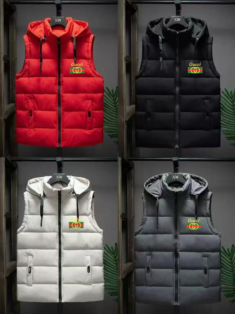 luxury street energy in these hooded puffer vests! Shiny oversized sleeveless quilted jackets with bold gold "Gucci" + GG stripe chest print – ultimate layering piece for Lagos drip.