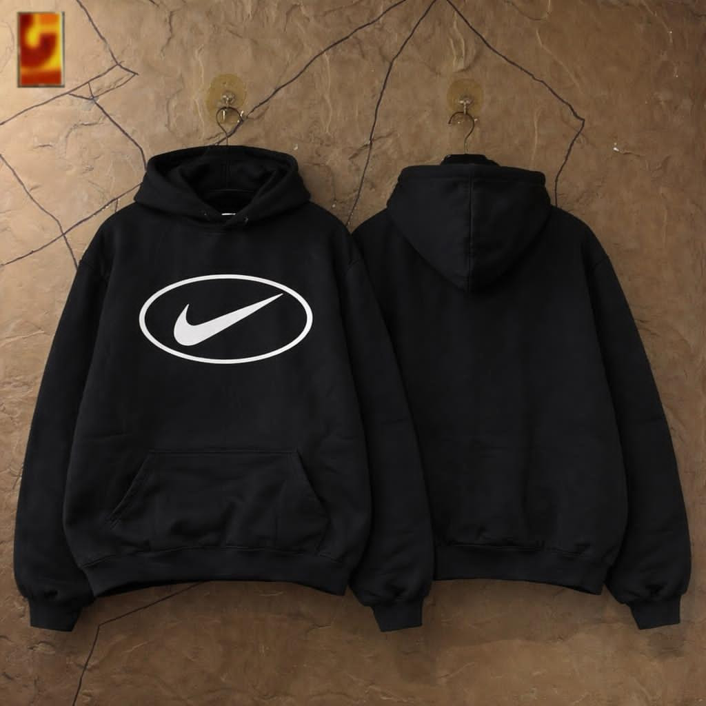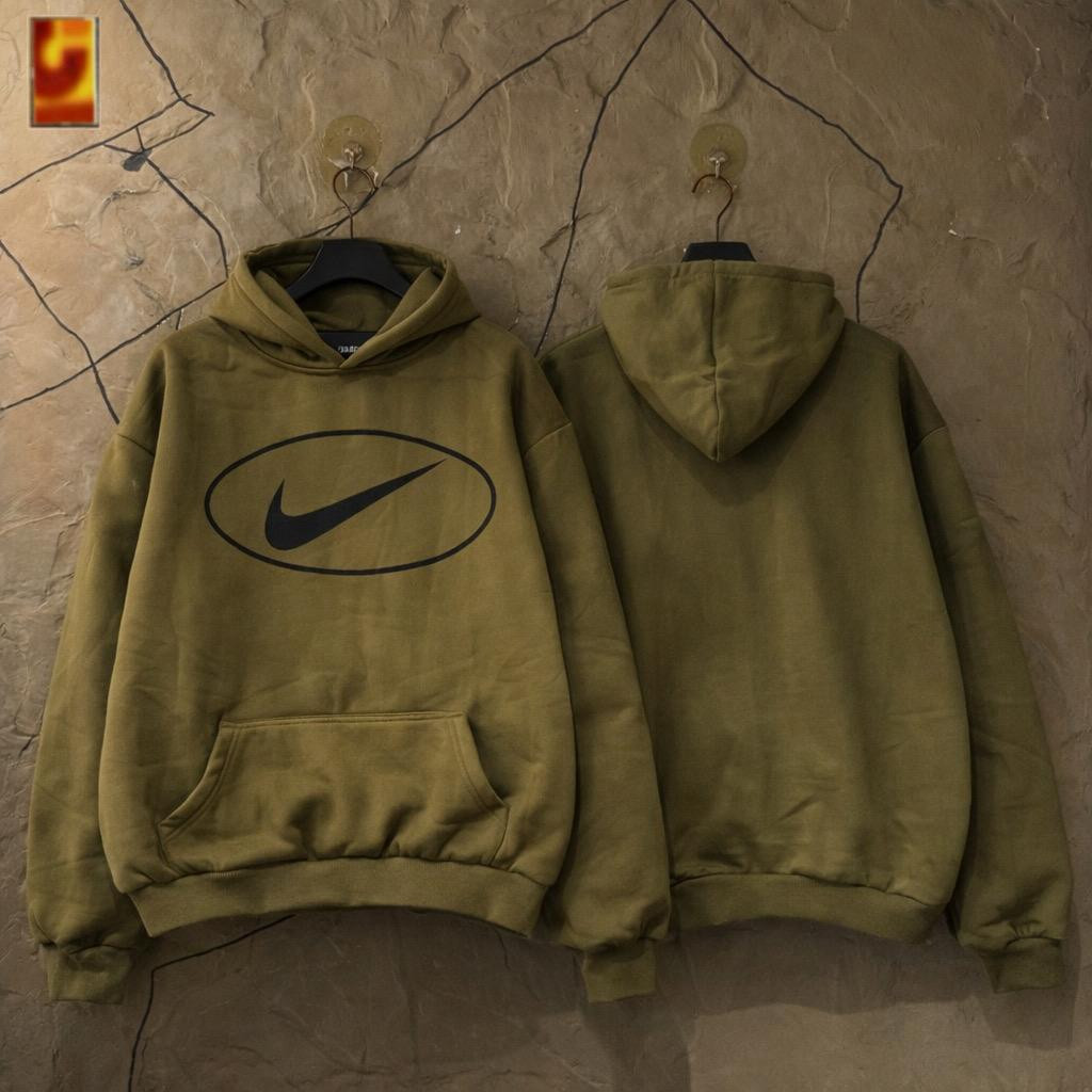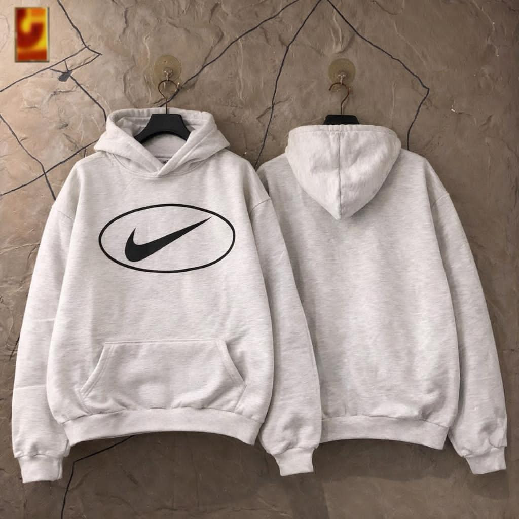 Embrace minimalist streetwear with this oversized pullover hoodie featuring a bold black oval-enclosed Nike Swoosh logo printed large on the chest – clean, iconic, and effortlessly cool! The light grey/heather white (soft off-white ash) fleece gives it a vintage, cozy vibe perfect for NYC winters—layer over tees, under jackets, or wear solo for that relaxed urban look.