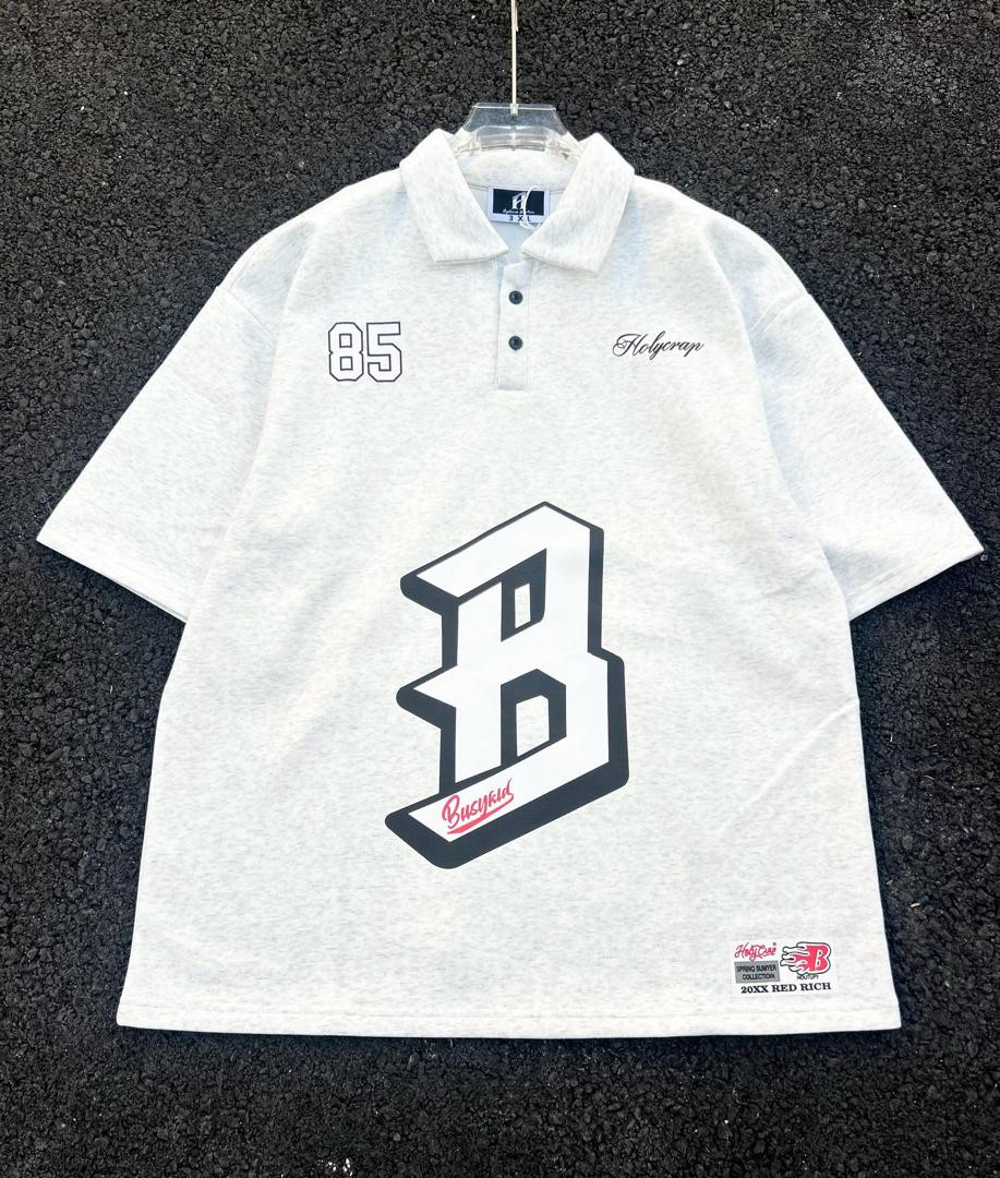 Heavy Lagos flex with these oversized number polos – Holycamp/BusyKus style with big "85"/"8" graphics + script branding!
