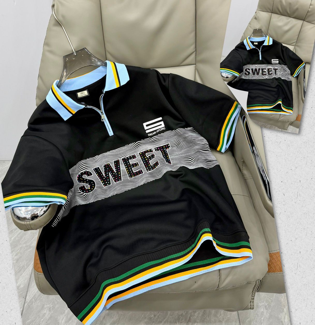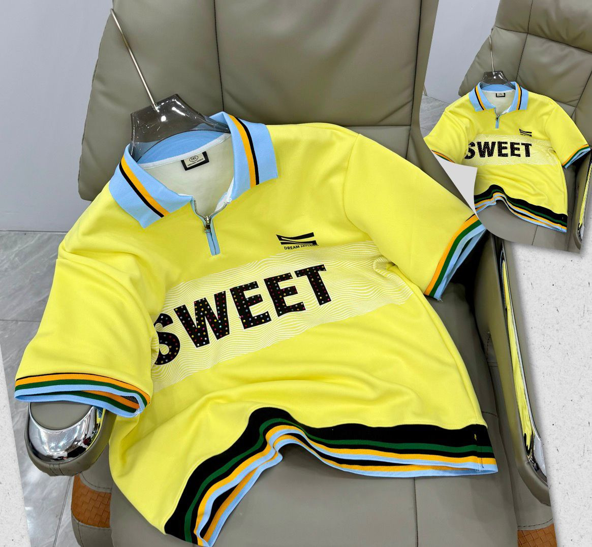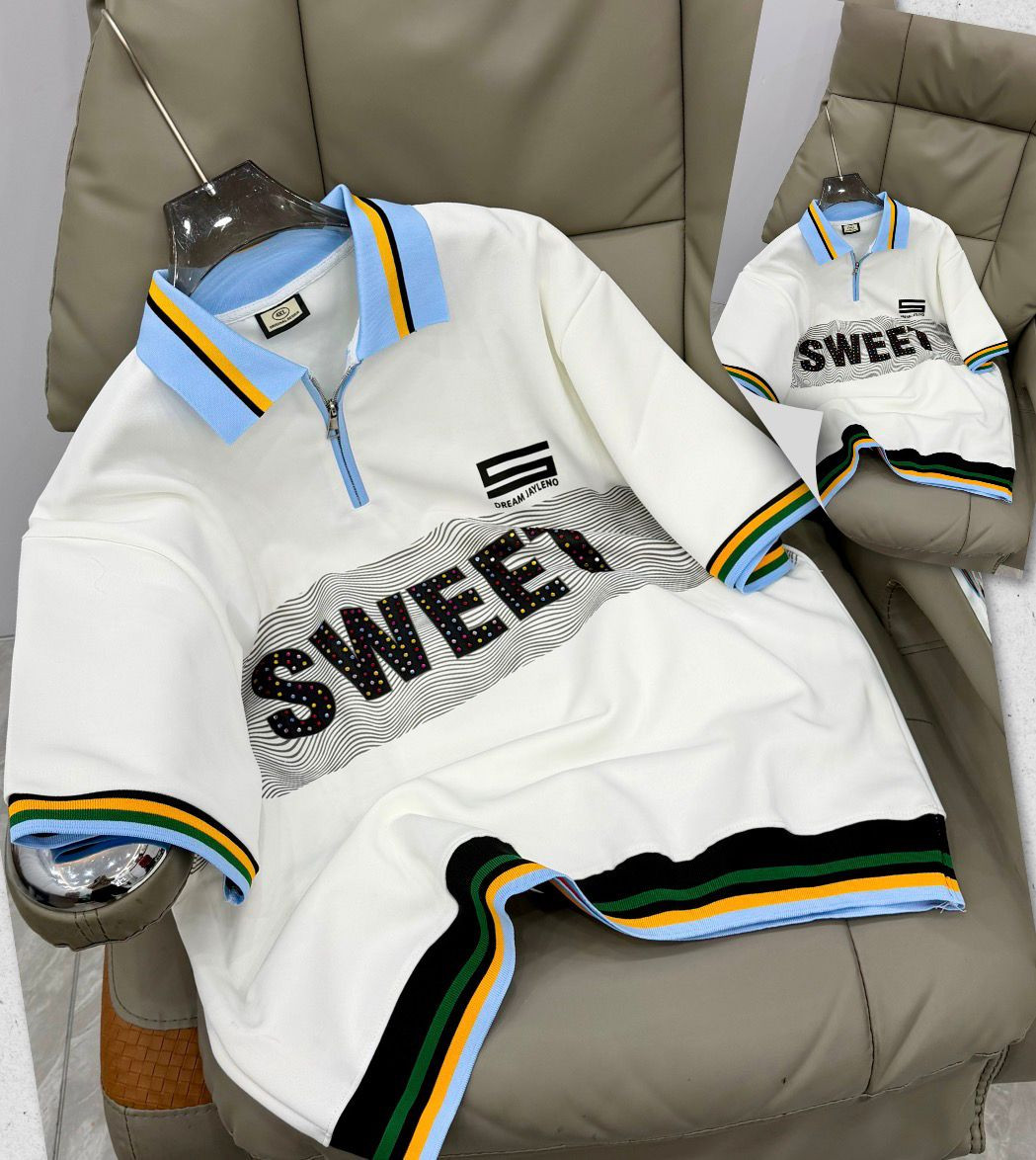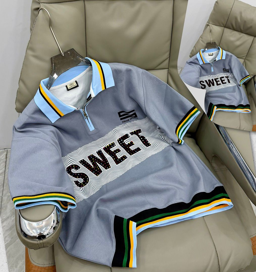 Bring retro-preppy heat with this grey oversized polo-style sweatshirt – short-sleeve zip-neck comfort meets bold "SWEET" drip for standout hype energy! The soft cotton-blend fleece offers cozy mid-weight warmth with a premium hand-feel, while the light blue spread collar, full quarter-zip placket, and multi-color striped ribbed cuffs/hem (blue/yellow/green/black) deliver classic polo vibes with modern street edge. The large wavy "SWEET" print in dotted/glittery black font dominates the chest, paired with small "DREAM JAYLINS" embroidery for subtle branding. Relaxed boxy fit with dropped shoulders, short sleeves, and longer untucked length provide effortless drape—perfect for Plumstead zipping up over tees with jeans/cargos/sneakers or unzipping for transitional preppy-street, Y2K-revival, retro-hype, or elevated casual flex in mild February weather.