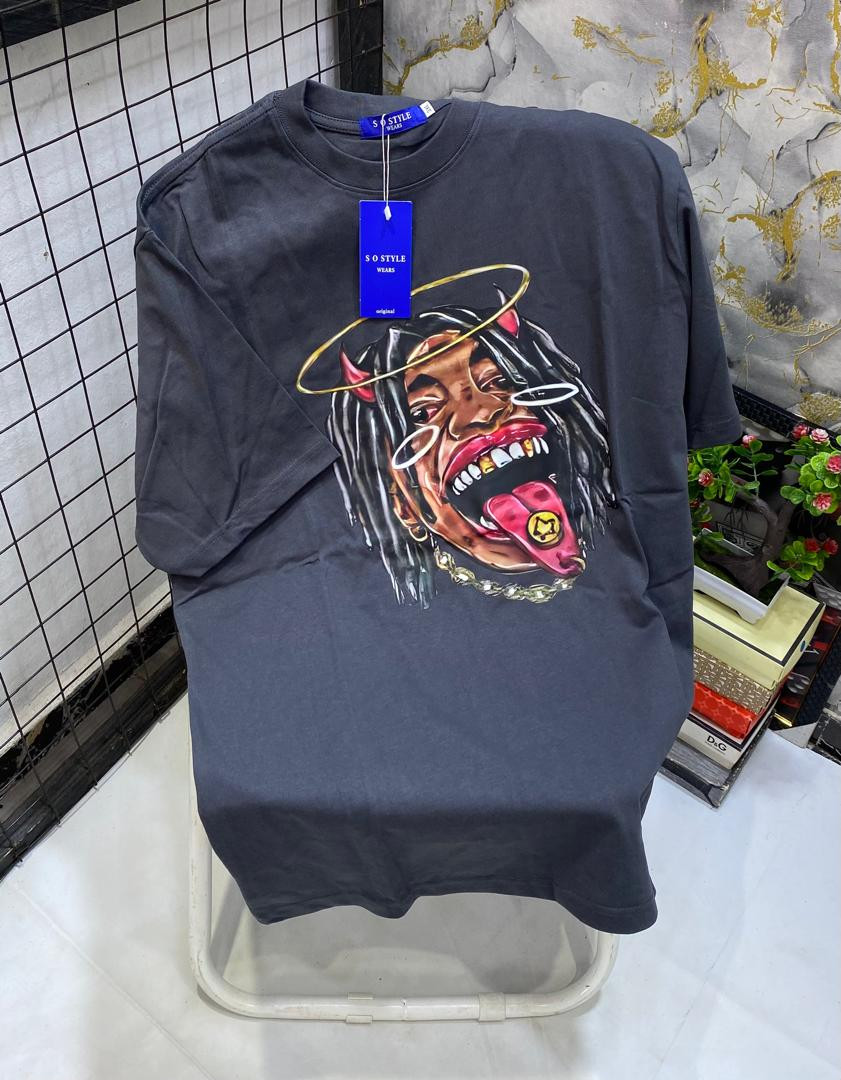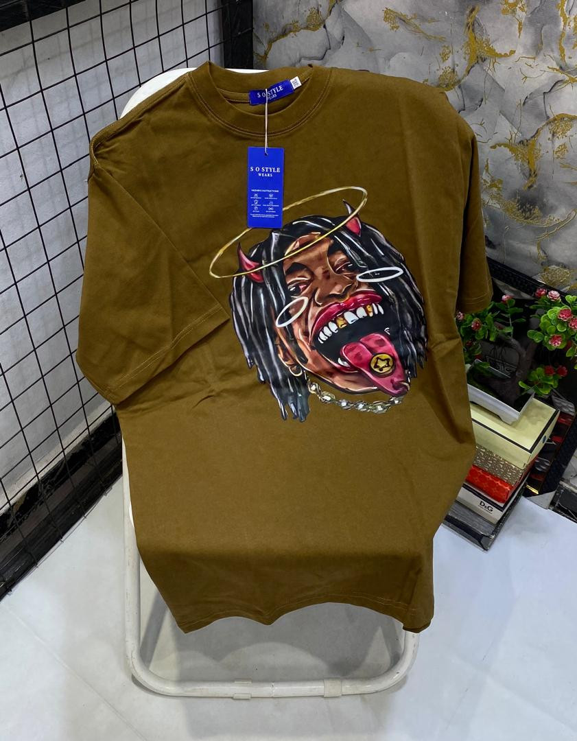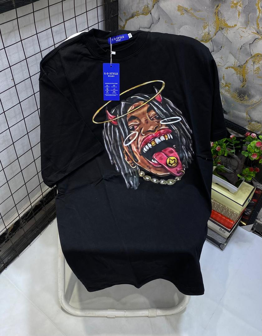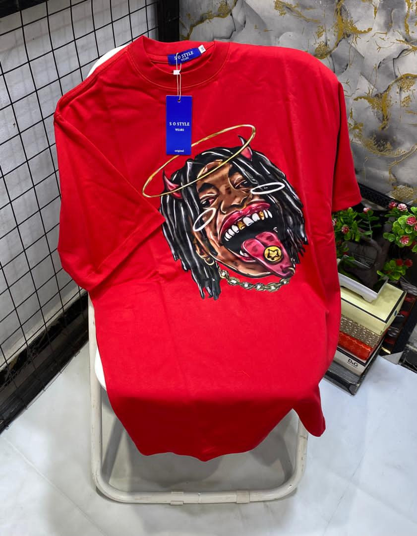 Drop instant heat with this red oversized graphic T-shirt – dripping with devilish-angelic attitude and maximalist street energy! The vibrant red cotton body serves as the perfect canvas for a striking large central print: a fierce character with long dreads, devil horns, gold halo, wild tongue out with gold grill/money sign, heavy chains, and intense expression in black/red/gold tones for insane contrast and detail. Relaxed boxy fit, dropped shoulders, longer untucked length, crewneck, short sleeves, and soft breathable fabric make it ultra-comfortable and versatile—perfect for Plumstead layering under hoodies/jackets in February chill or solo with jeans/cargos/sneakers for edgy hip-hop-hype, Y2K-revival, alt-street, or bold casual flex.