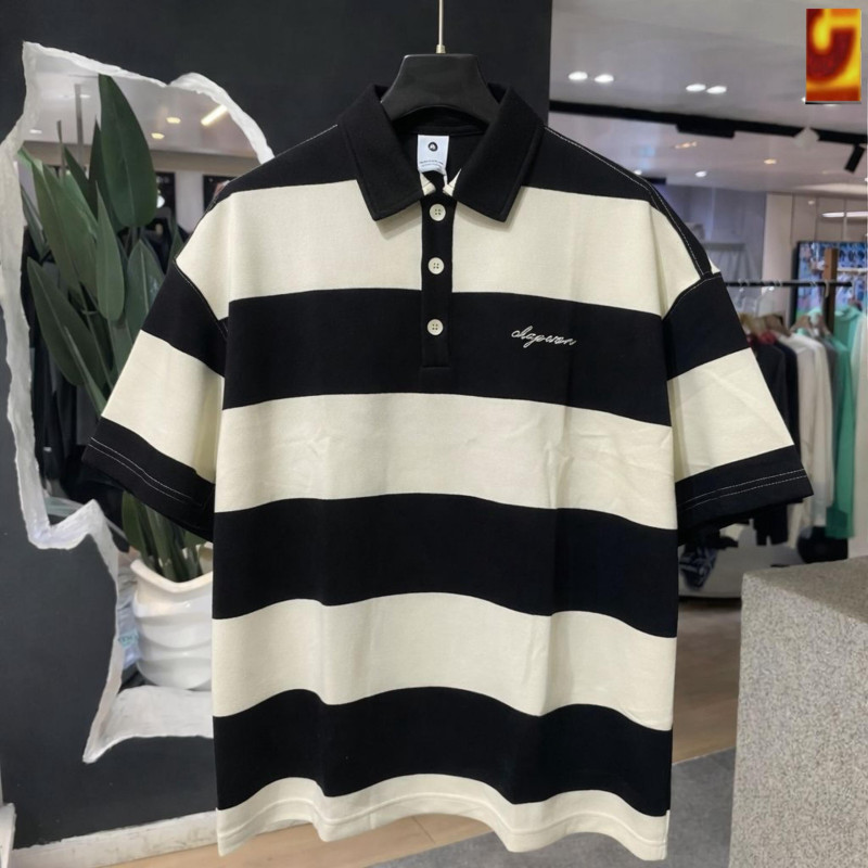 Timeless and sharp with this olegapan striped polo – oversized preppy-street perfection in black + cream!
