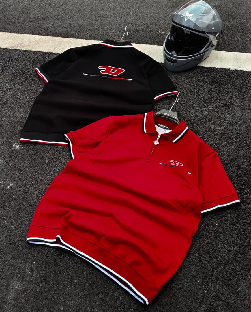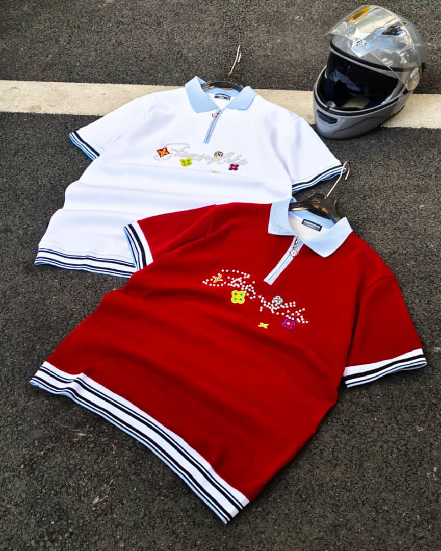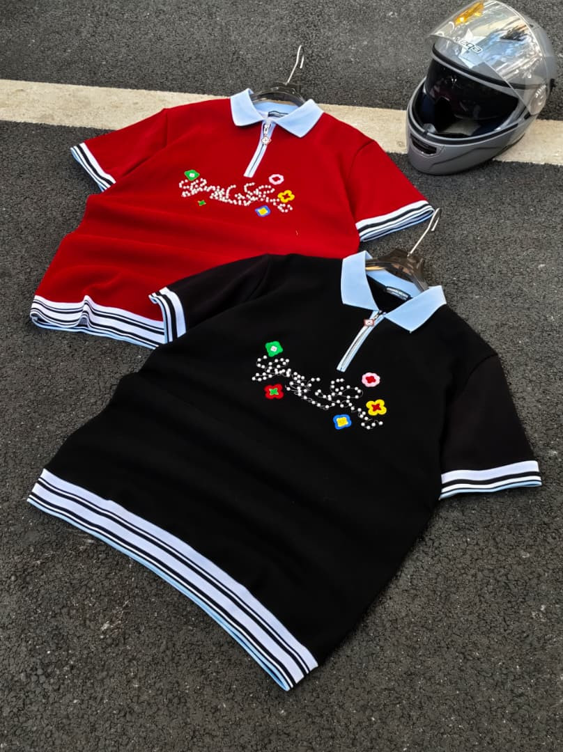 pearl beaded floral polo! Vibrant red or classic black with colorful flower beadwork, contrasting collar/cuffs – short sleeve & chic for Lagos casual flex.
