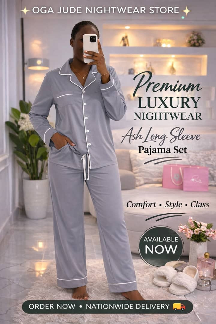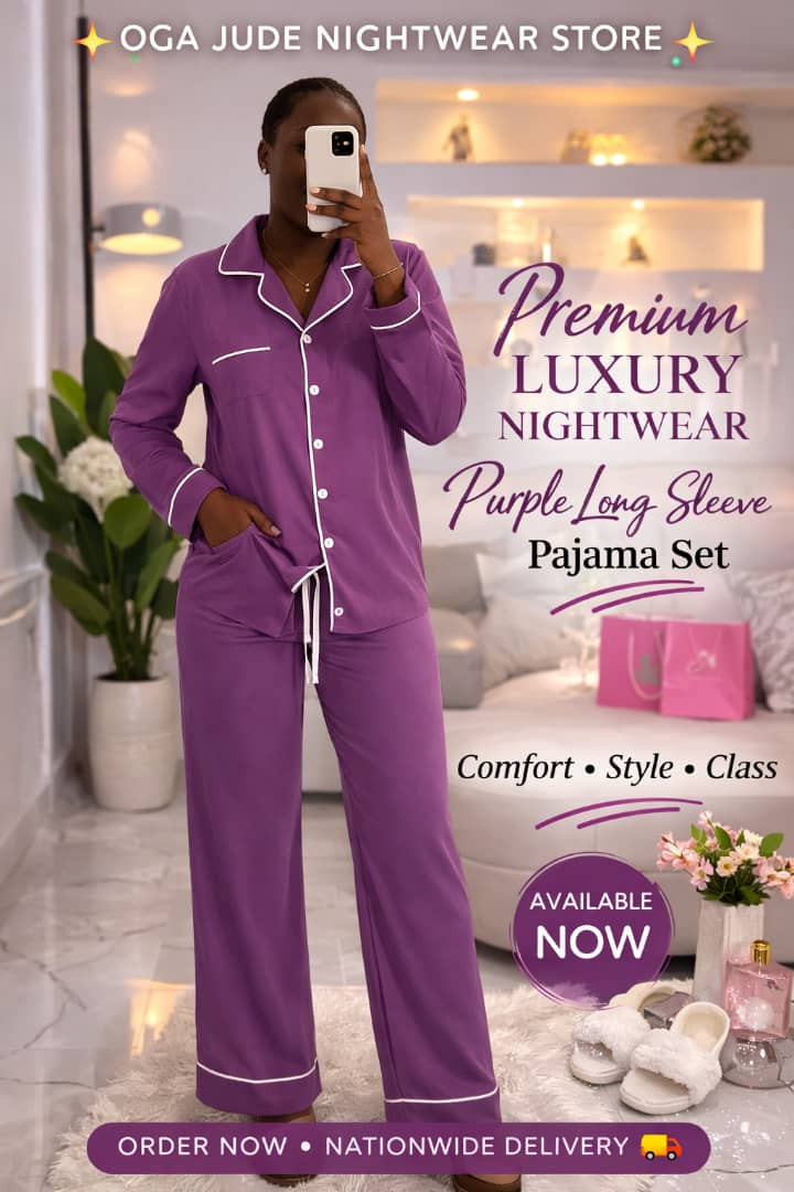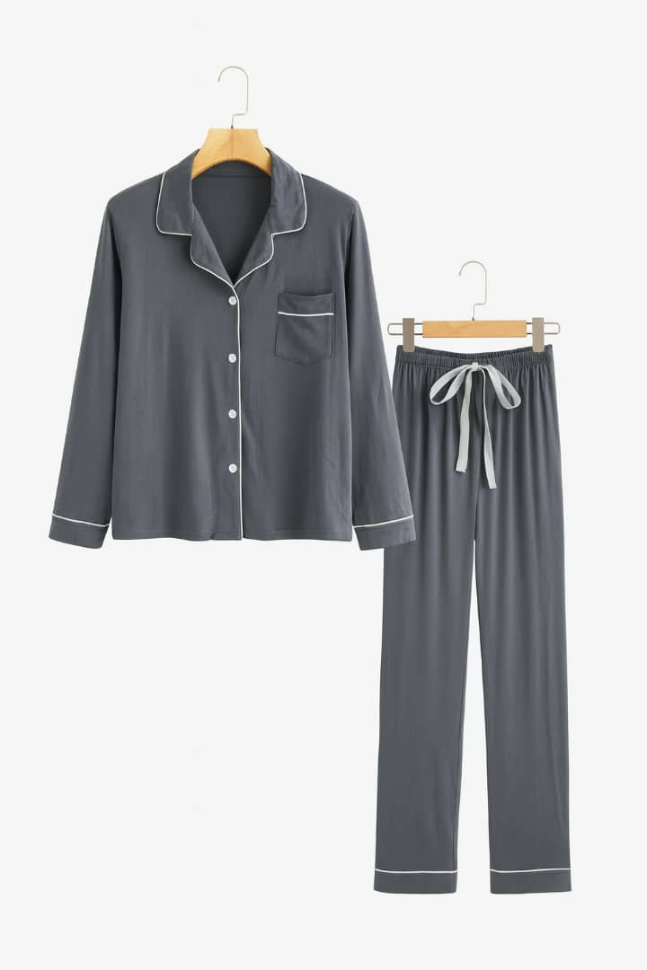 Elegant cozy vibes in this ? plum purple pajama set! Soft satin-like long-sleeve button-up + matching drawstring pants with delicate white piping – ultimate minimalist luxury for lounging, sleeping, or gifting.