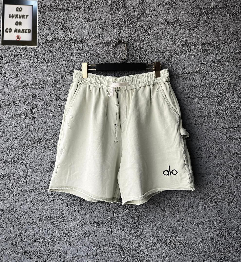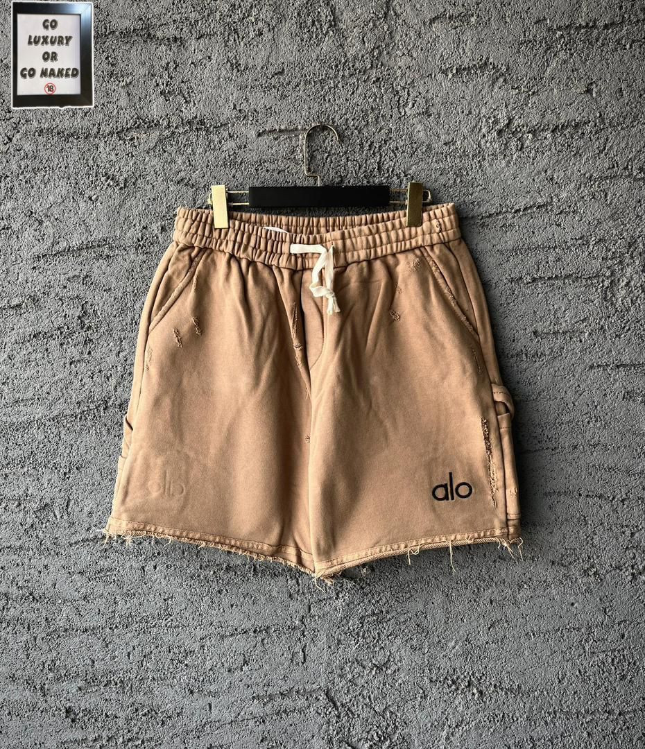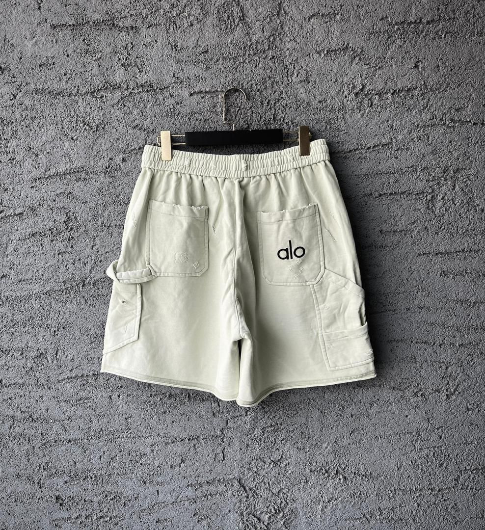 Cozy premium vibes in these ? sage green cargo shorts! Soft faded wash cotton blend with multiple pockets, distressed edges, and embroidered "alo" on back flaps – relaxed utility style for Lagos street flex.