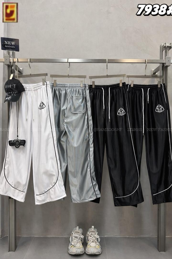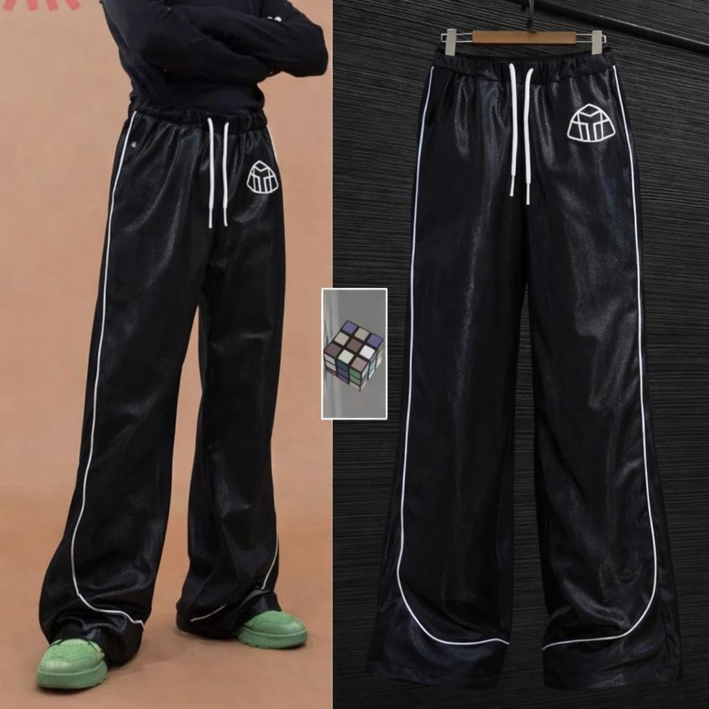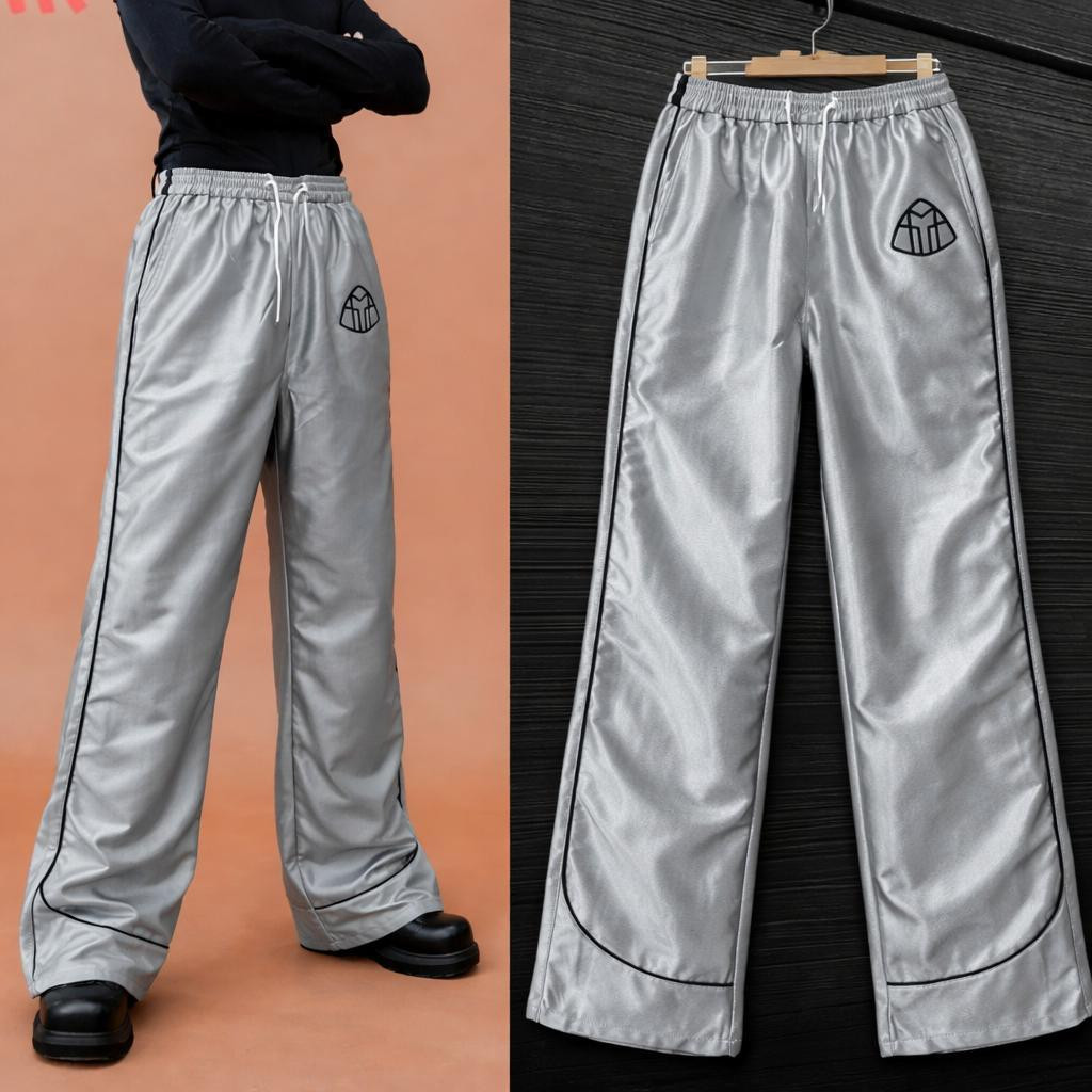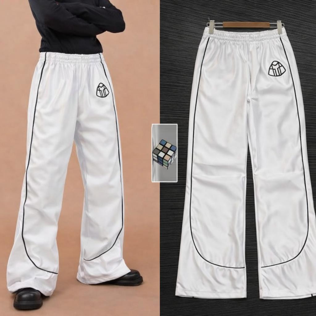 Elevate your loungewear with these ? satin wide-leg track pants! Shiny silky fabric in white, silver, or black with side stripe piping and small diamond logo on thigh – relaxed baggy fit for ultimate comfort and streetwear style.
