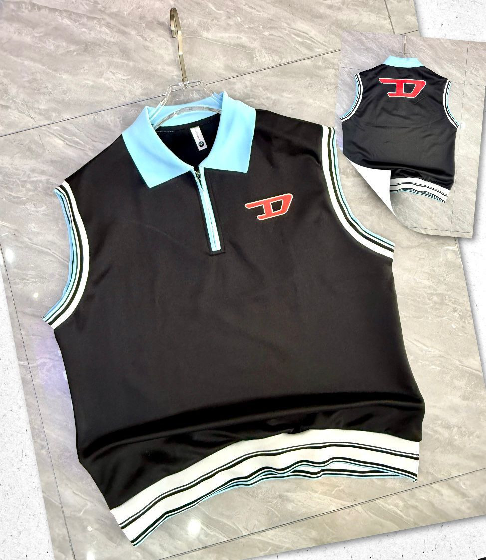 Drop clean retro energy with this black sleeveless polo vest – sporty-preppy streetwear with bold red D logo and light blue accents! The matte black body contrasts sharply with the light blue collar and blue/white striped ribbing on collar, armholes, and hem, while a standout red "D" embroidery on the chest delivers clean hype branding. Half-zip placket with light blue zipper pull, oversized boxy fit, dropped armholes, longer length, ribbed details, and side slits make it ultra-comfortable and versatile—perfect for Plumstead layering over long-sleeve tees/hoodies in February chill or solo with joggers/cargos/sneakers for athletic-preppy, hype casual, sporty-street, or golf-inspired looks.